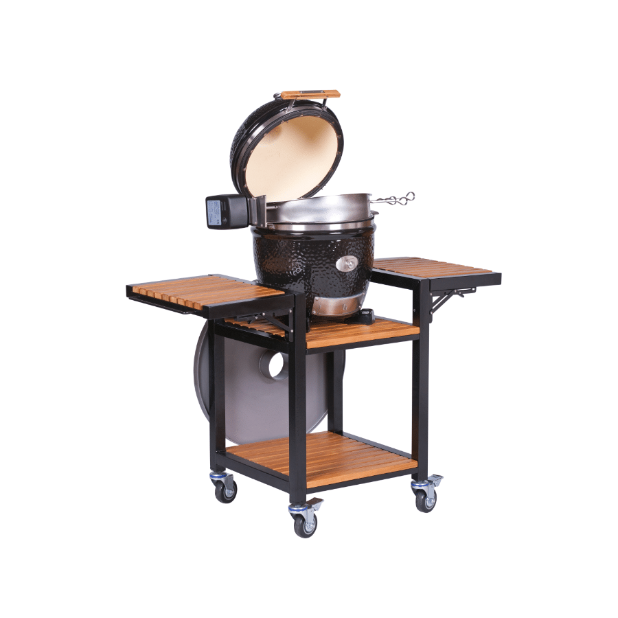ICON & Junior primesc propriul lor cărucior! Un cadru acoperit cu pulbere neagră și măsuțe laterale din lemn de salcâm oferă micilor vedete ale familiei Monolith Grill o bază mobilă elegantă. În partea din spate există un suport convenabil pentru placa de foc asortată, astfel încât aceasta este întotdeauna la bord și are propriul loc de depozitare dedicat. Pe nivelul inferior de depozitare există suficient spațiu pentru alte accesorii. Caracteristici:- Potrivit pentru Icon și Junior