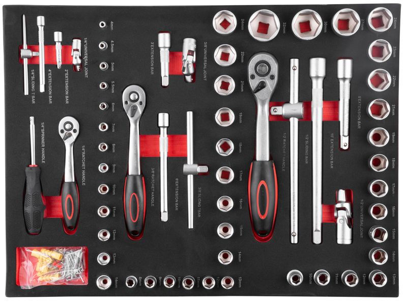 - Capete tubulare: 13x 1/4", 15x 3/8", 17x 1/2" + tubulare lungi (1/4", 3/8", 1/2")