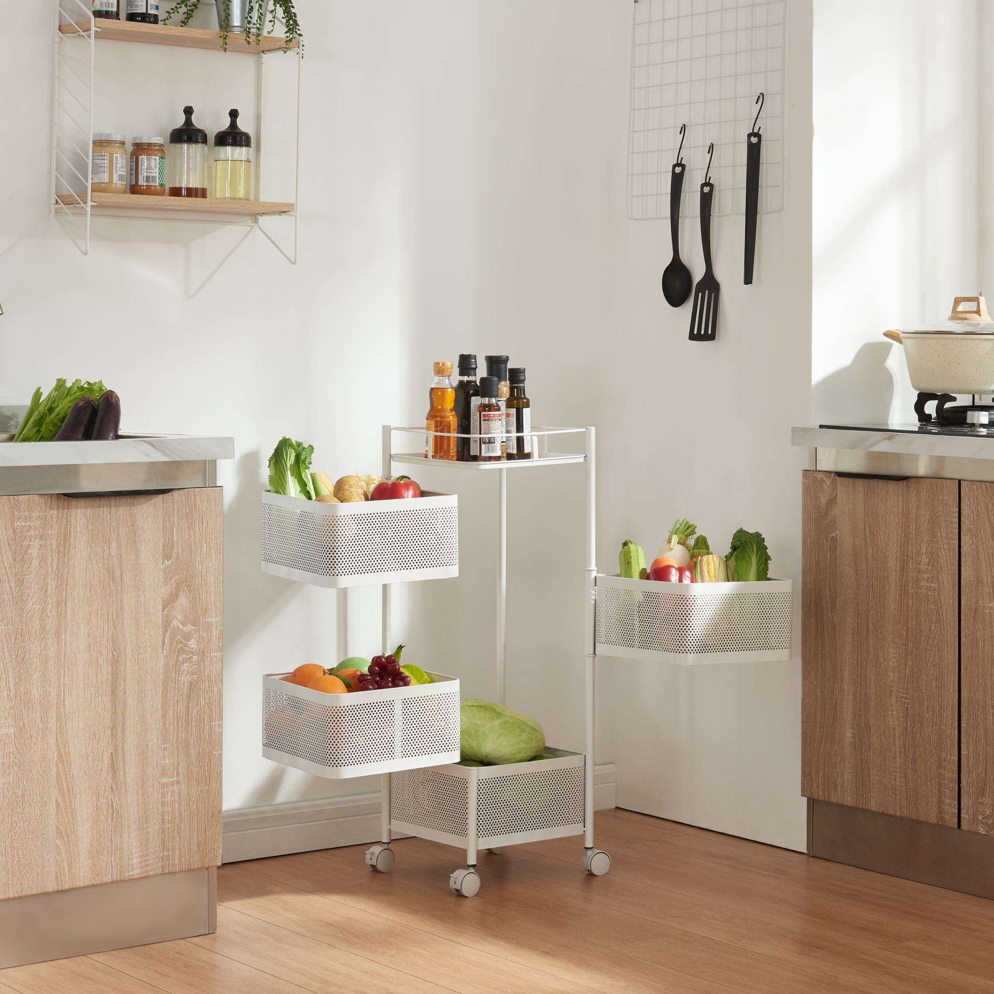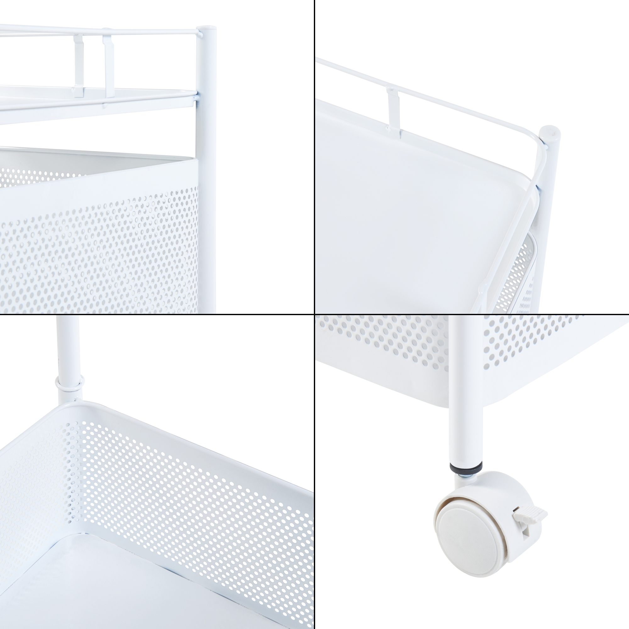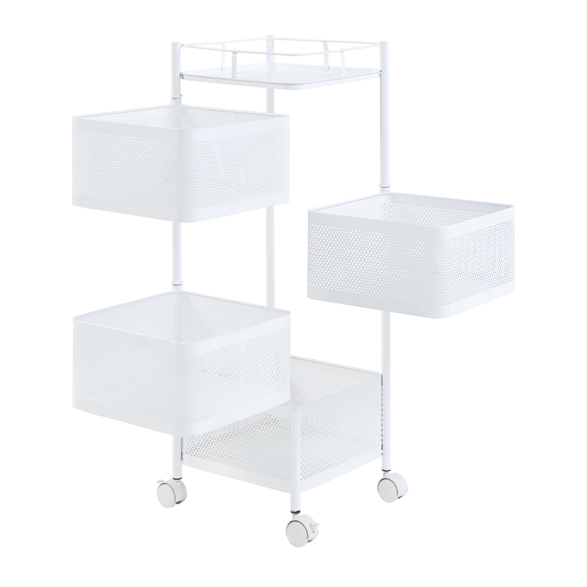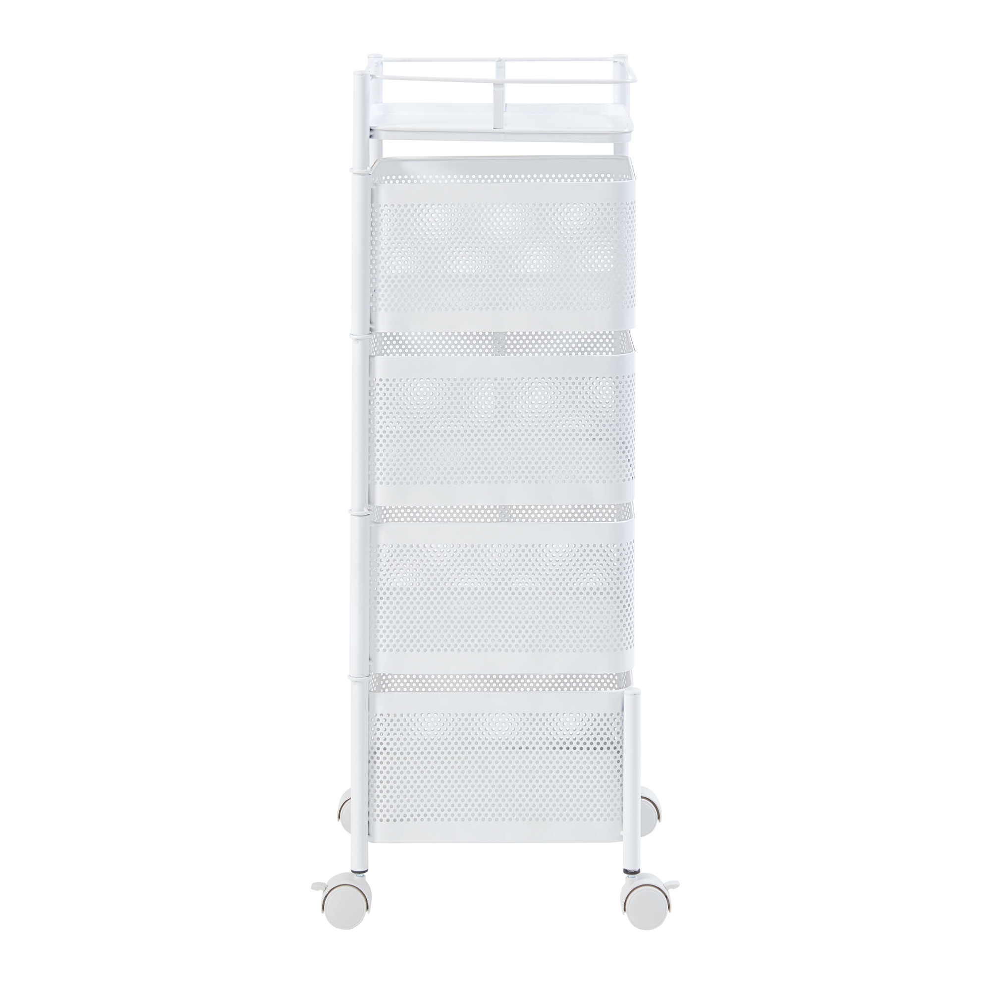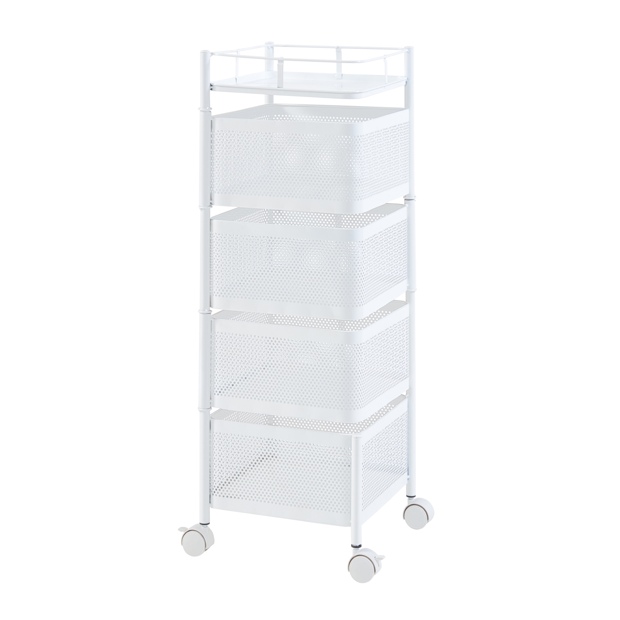 Prevăzut cu 4 coșuri de depozitare și o poliță superioară tip tavă, acest cărucior cu roți este ideal pentru depozitarea condimentelor, fructelor, băuturilor, produselor de îngrijire sau accesoriilor de birou. Primele trei coșuri sunt rabatabile, pentru acces rapid și depozitare comodă, iar cele 4 roți permit mutarea ușoară dintr-o cameră în alta.