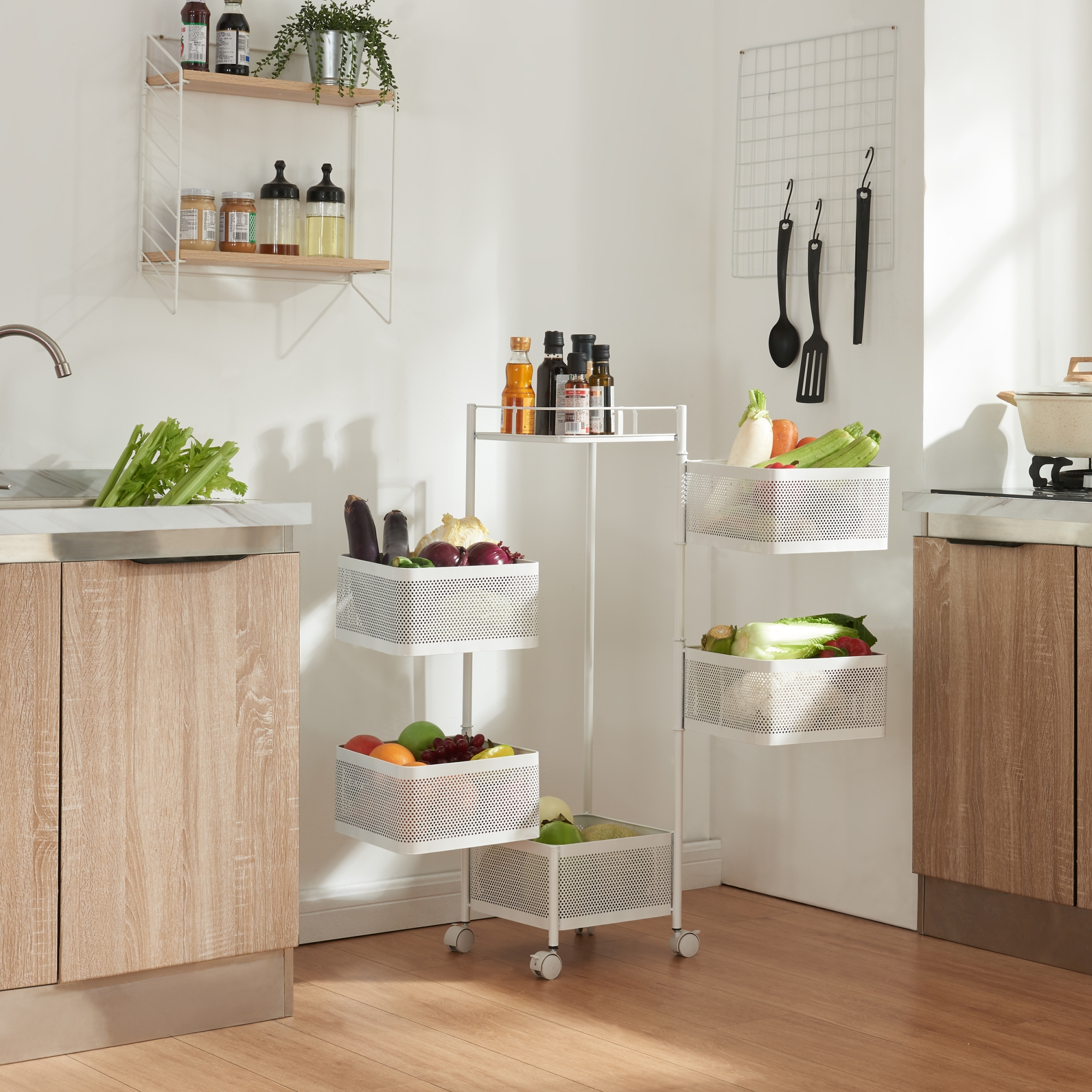Poate fi folosit ca cărucior pentru bucătărie pentru condimente și ustensile, ca suport mobil în baie pentru cosmetice și produse de igienă sau ca organizator de birou pentru documente și accesorii. Este o alegere practică pentru spațiile mici unde fiecare centimetru contează.