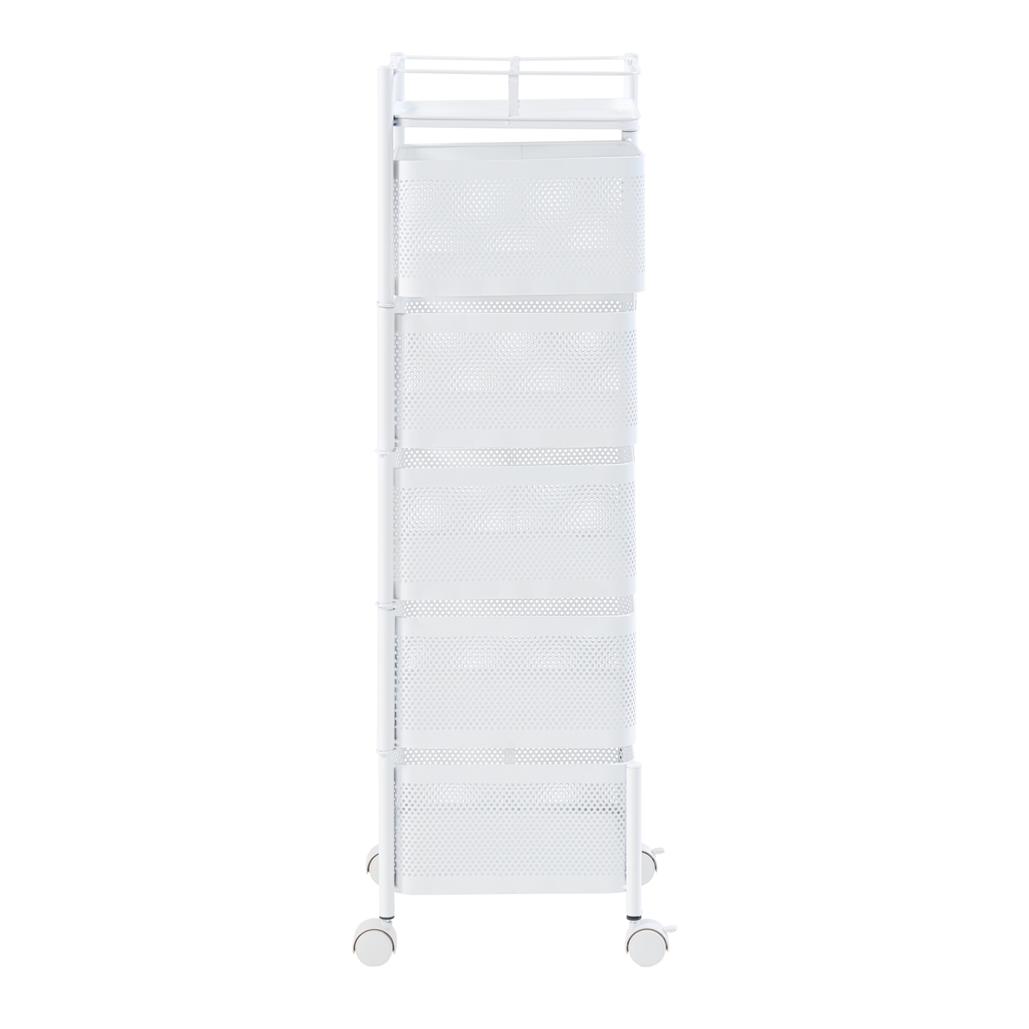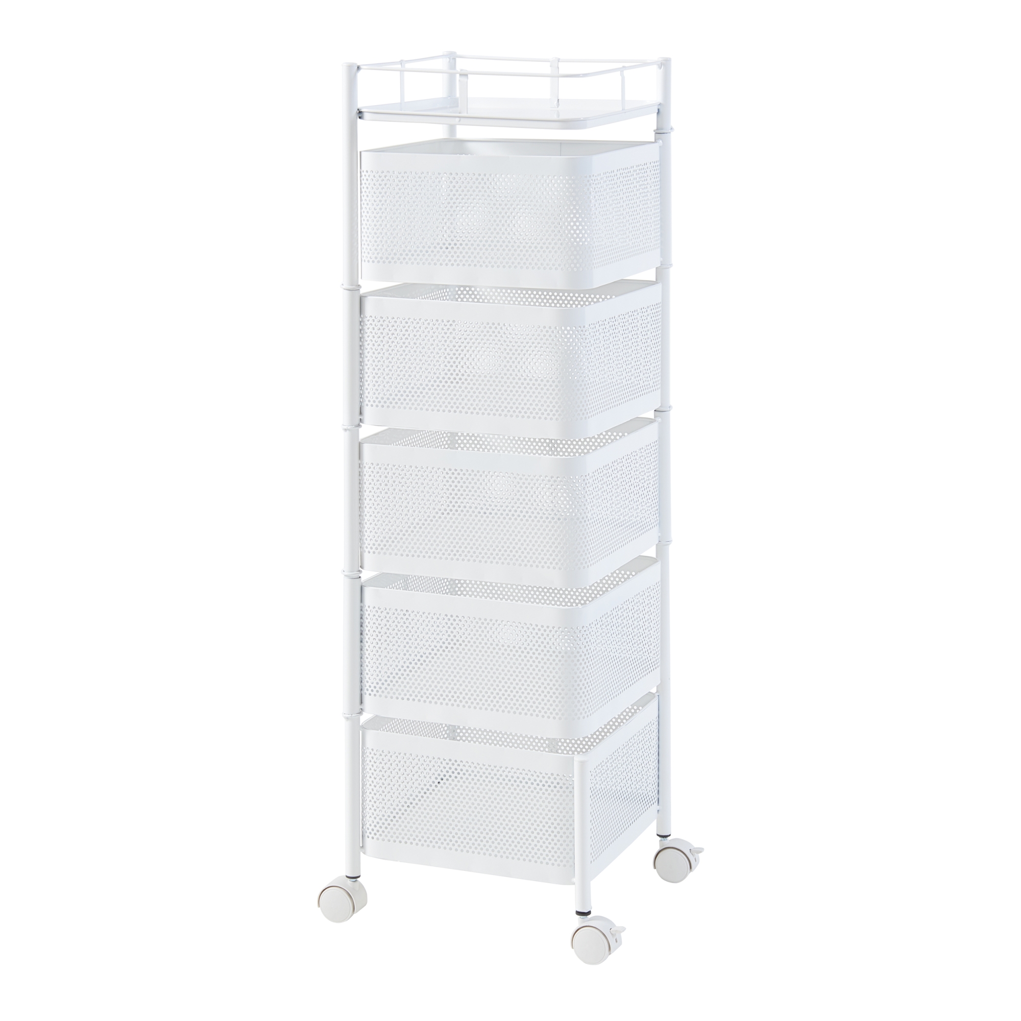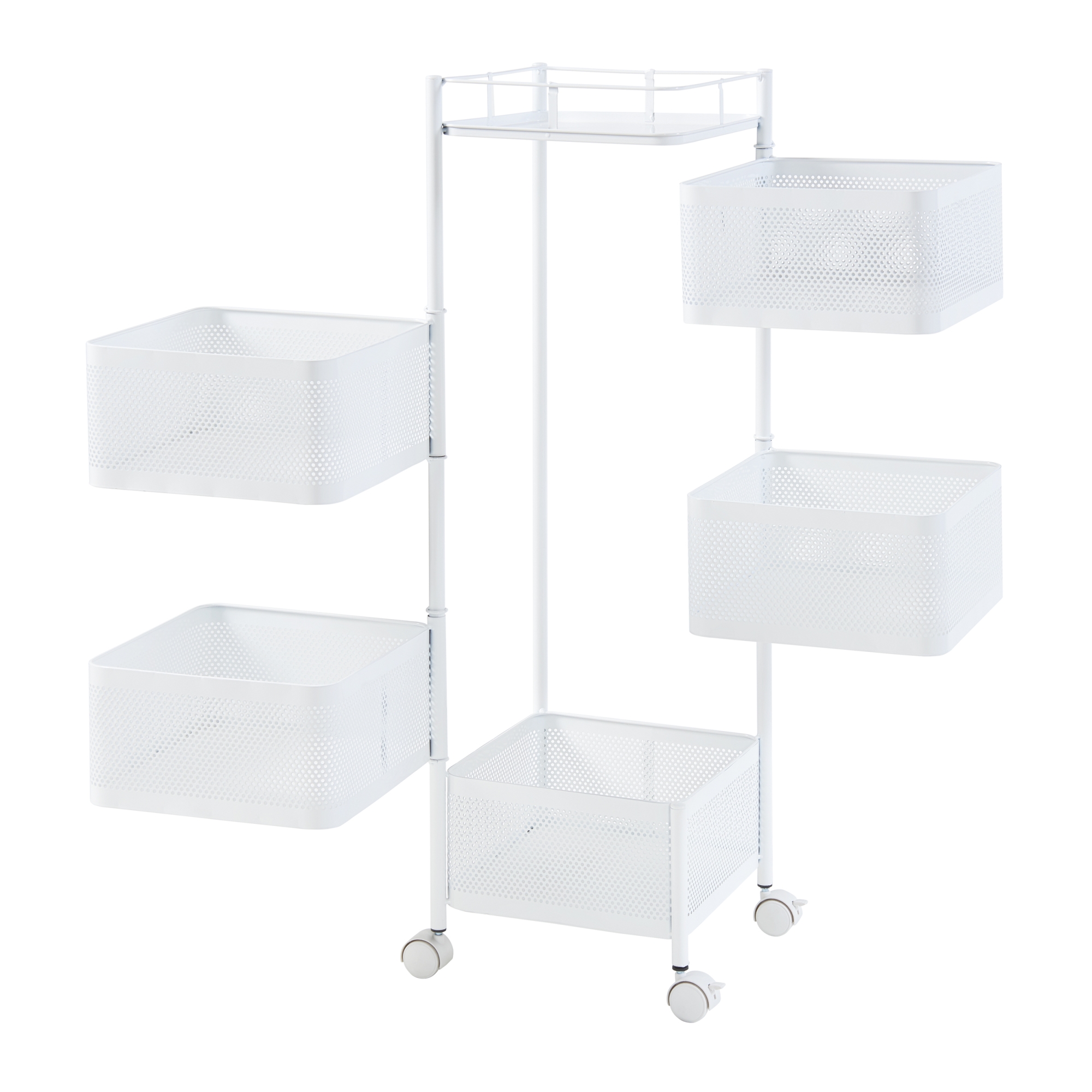 Prevăzut cu 5 coșuri de depozitare și o tavă superioară practică, acest cărucior cu roți este perfect pentru depozitarea condimentelor, sticlelor, gustărilor, produselor de îngrijire sau accesoriilor de birou. Primele patru coșuri sunt rabatabile, pentru acces mai rapid și depozitare mai comodă.