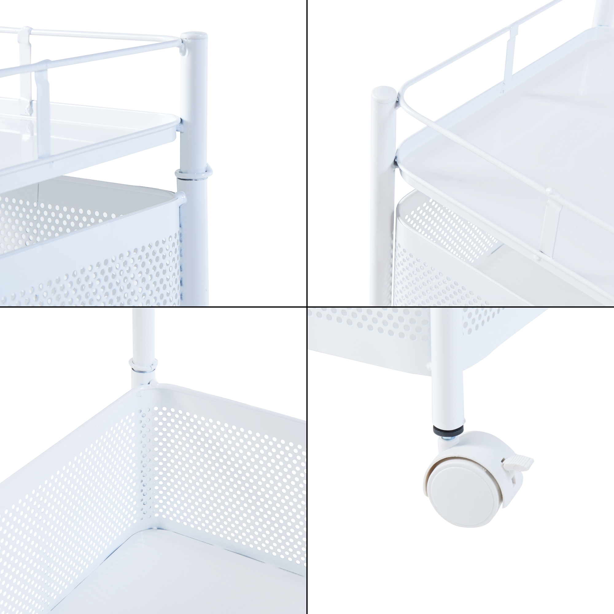 Cele patru roți pivotante permit mutarea ușoară dintr-o cameră în alta, iar două dintre ele sunt prevăzute cu frână pentru stabilitate sporită. Construcția din oțel oferă rezistență bună în utilizarea de zi cu zi, iar finisajul alb se integrează ușor în diferite stiluri de amenajare.