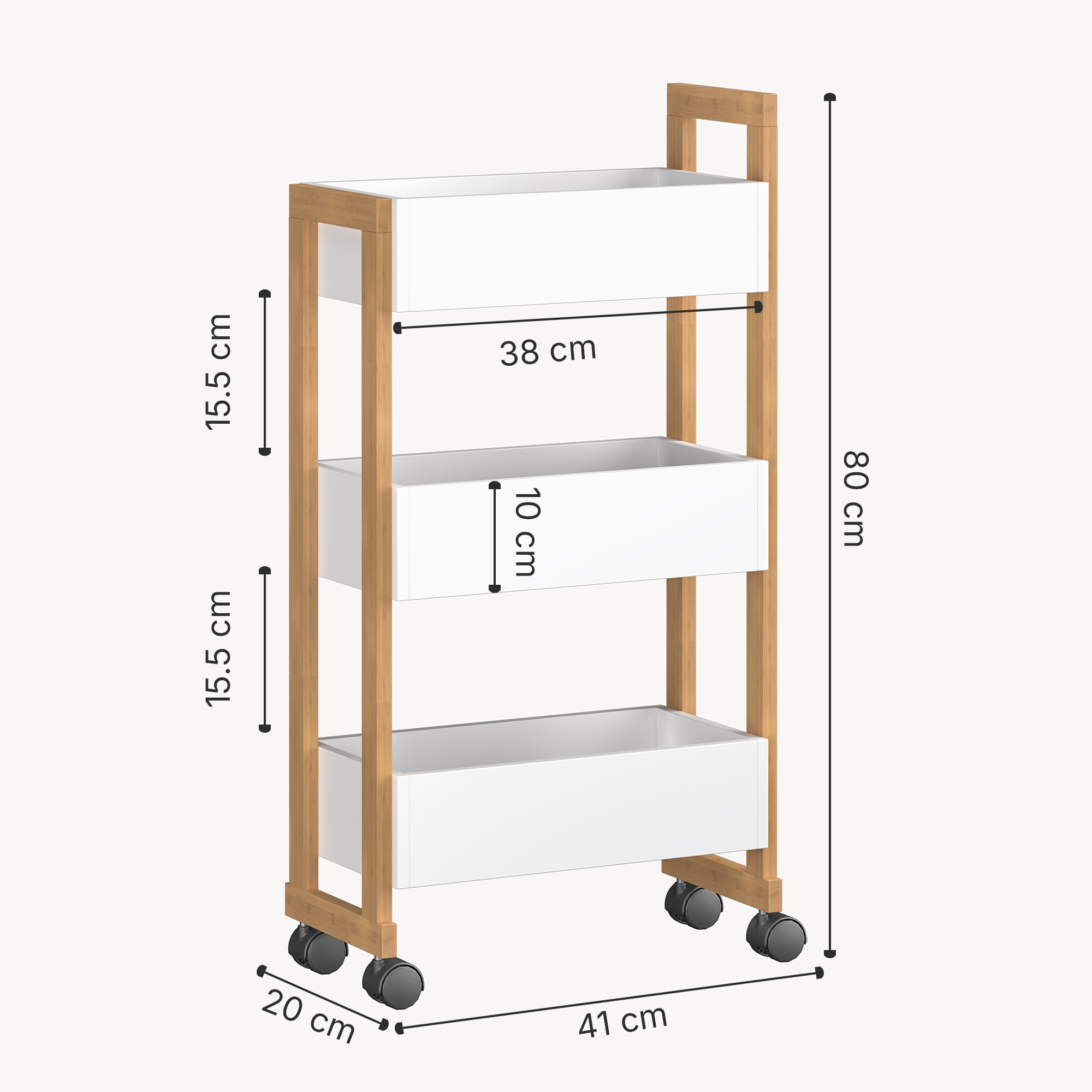 Cărucior de depozitare îngust Varulta cu 3 polițe, bambus alb, 80x41x20 cm
