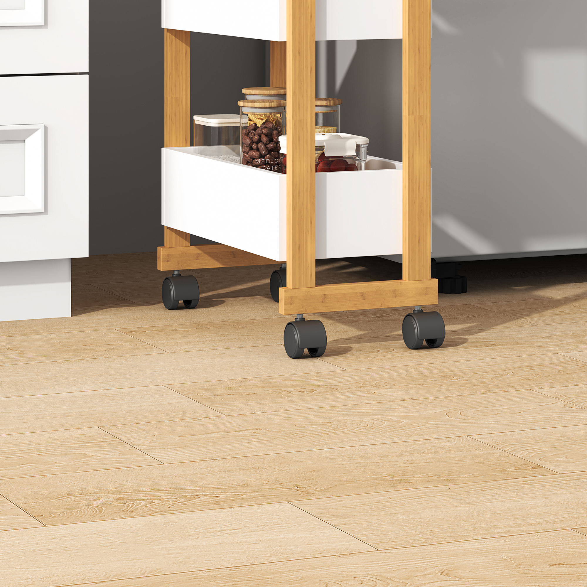Designul în combinație bambus natur și alb aduce un aspect modern și versatil, potrivit în bucătărie, baie sau spălătorie. Cele 4 roți asigură mobilitate excelentă, iar 2 roți cu frână oferă stabilitate atunci când vrei să îl fixezi într-un singur loc.
