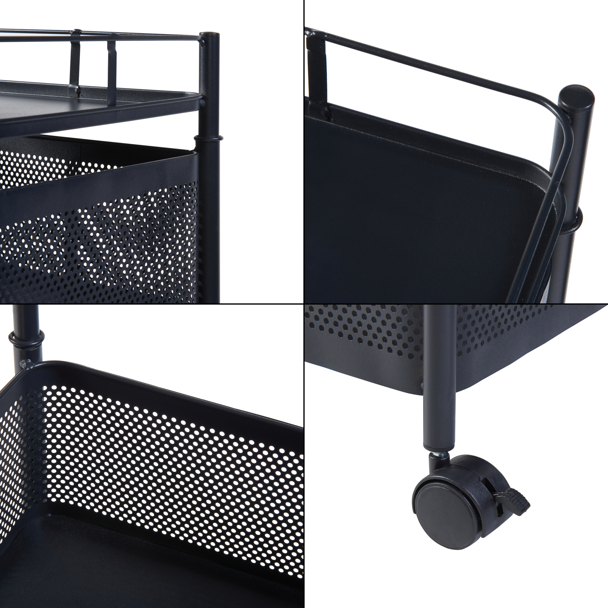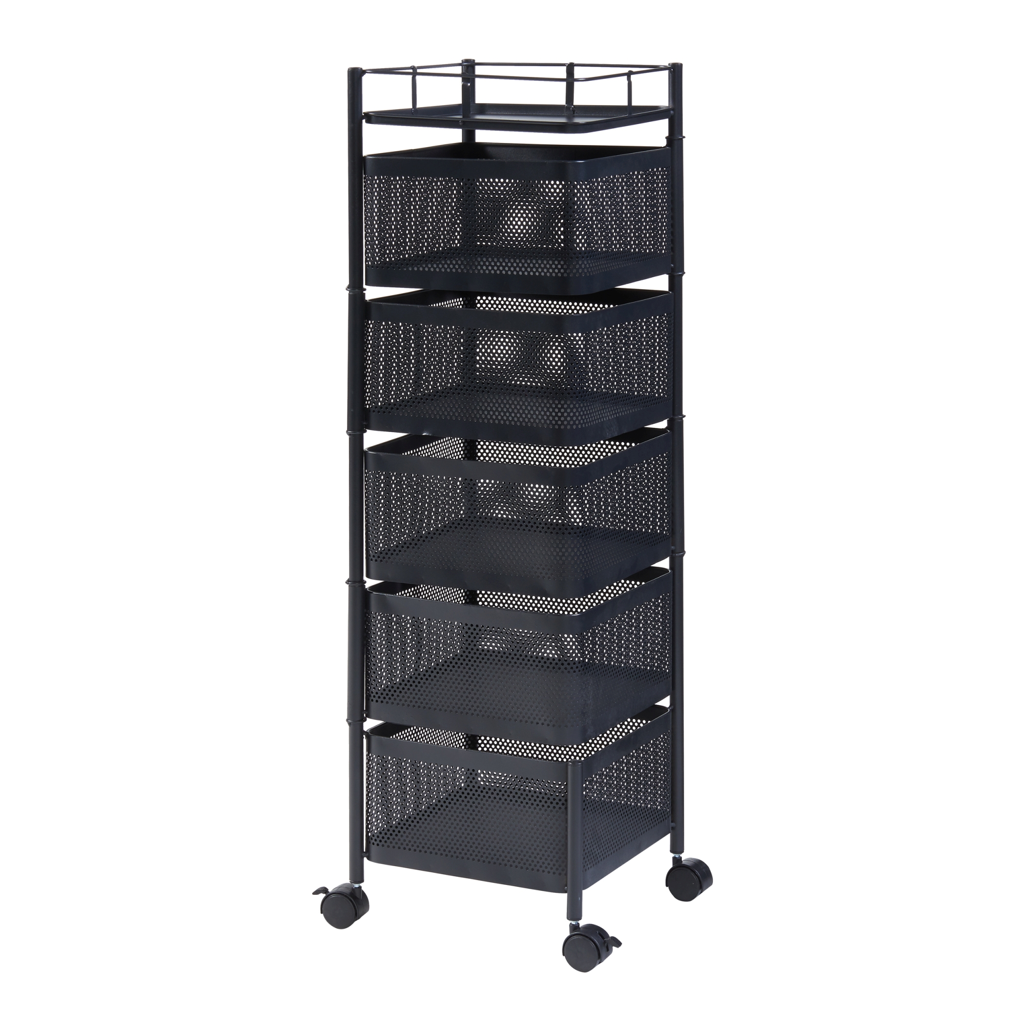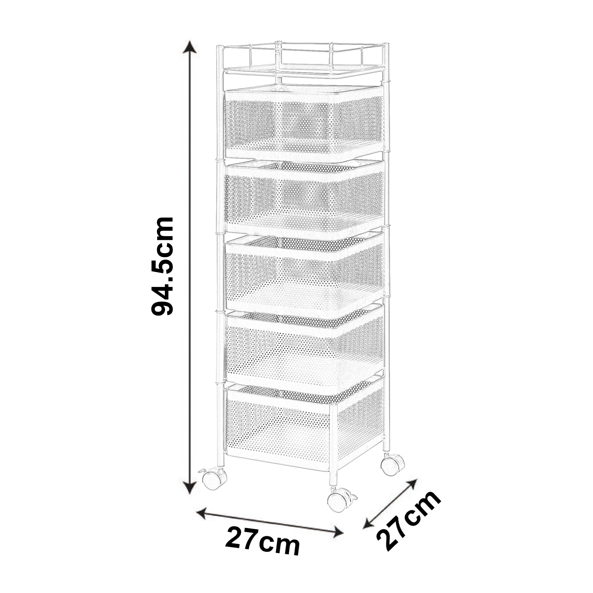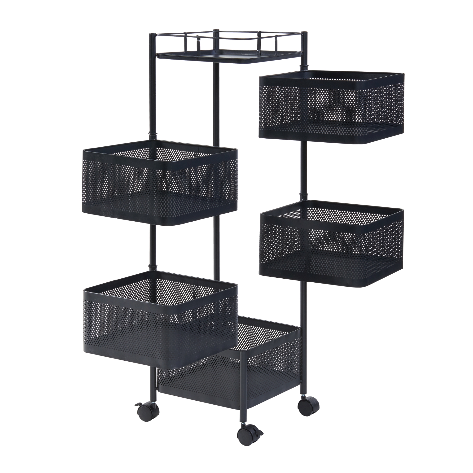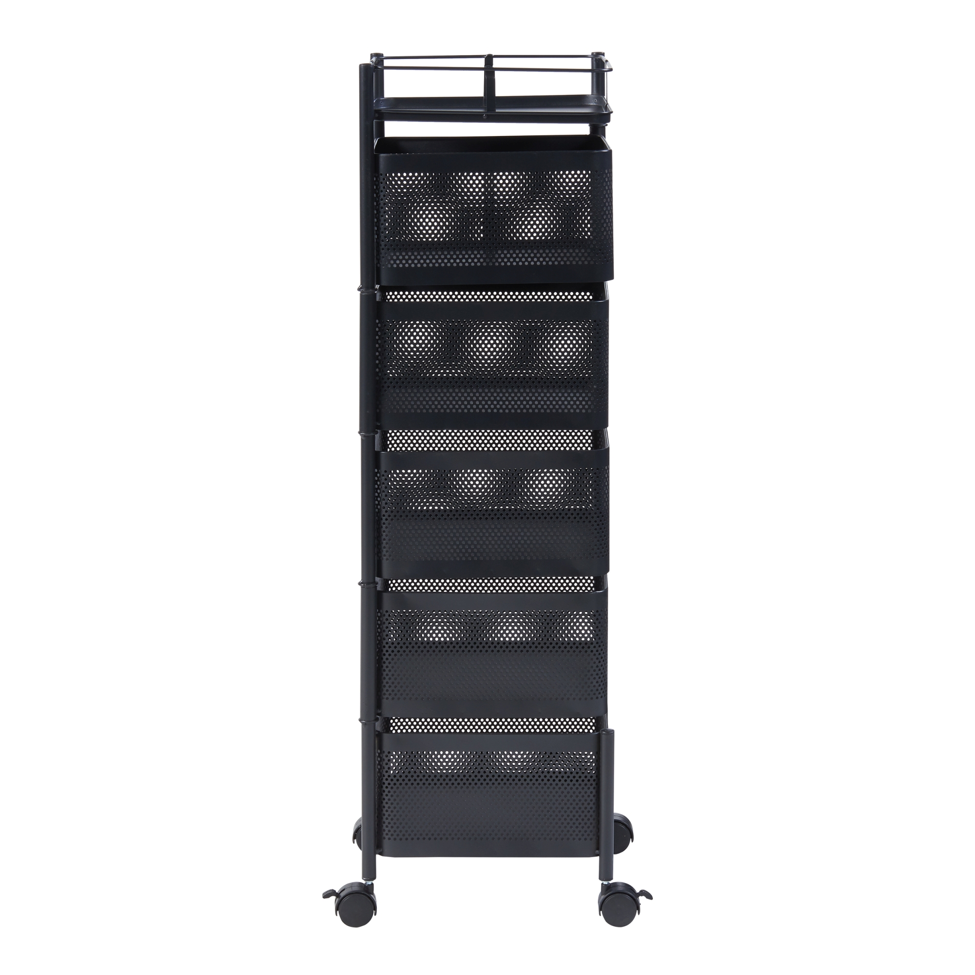 Prevăzut cu 5 coșuri de depozitare și o poliță superioară tip tavă, acest raft mobil cu roți este ideal pentru veselă, sticle, gustări, condimente, produse de îngrijire sau accesorii de birou. Cele patru coșuri superioare sunt rabatabile, astfel încât depozitarea și accesarea obiectelor devin mai simple și mai confortabile.