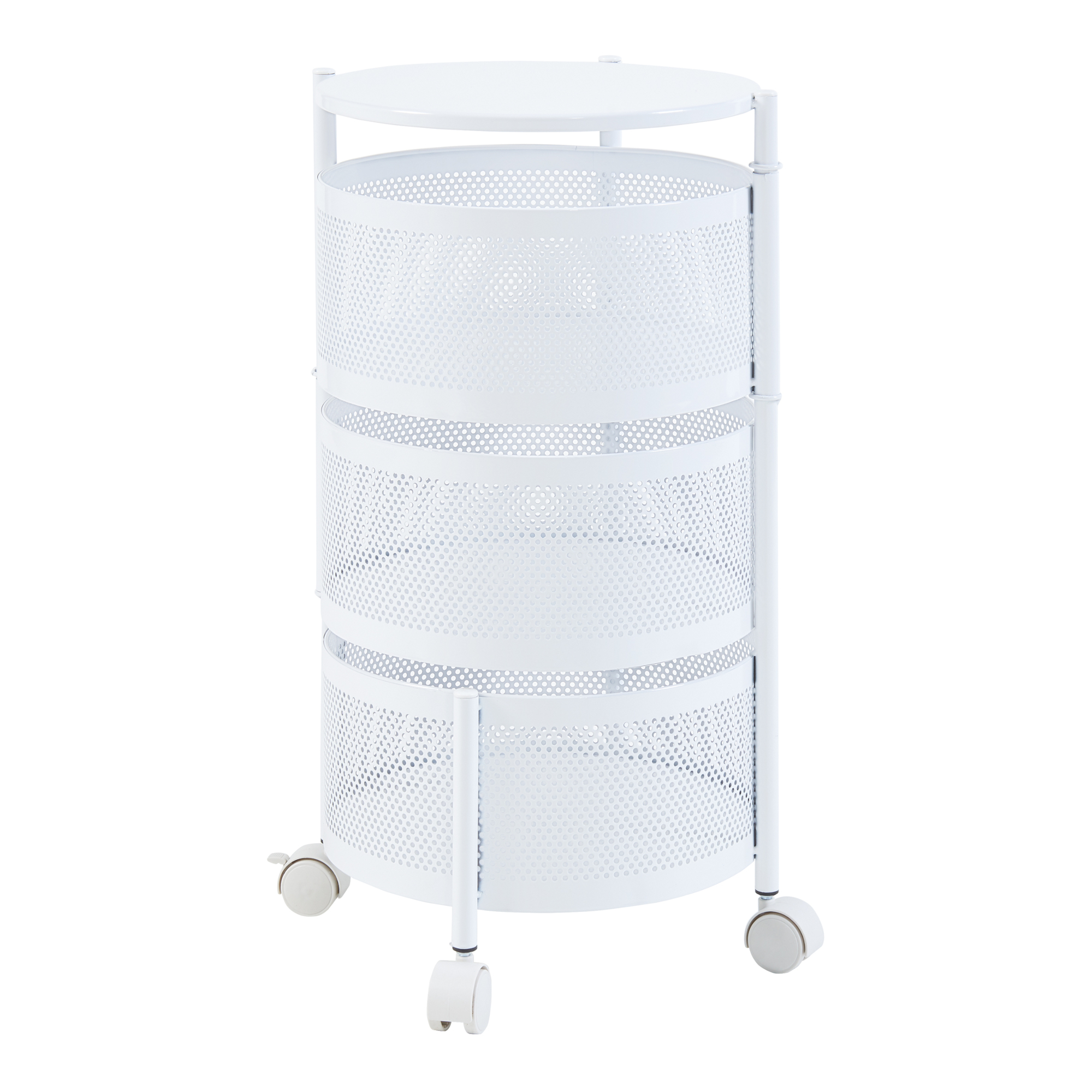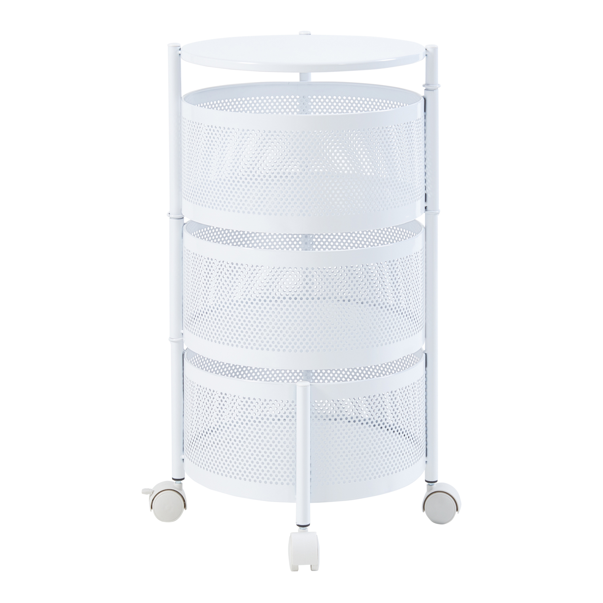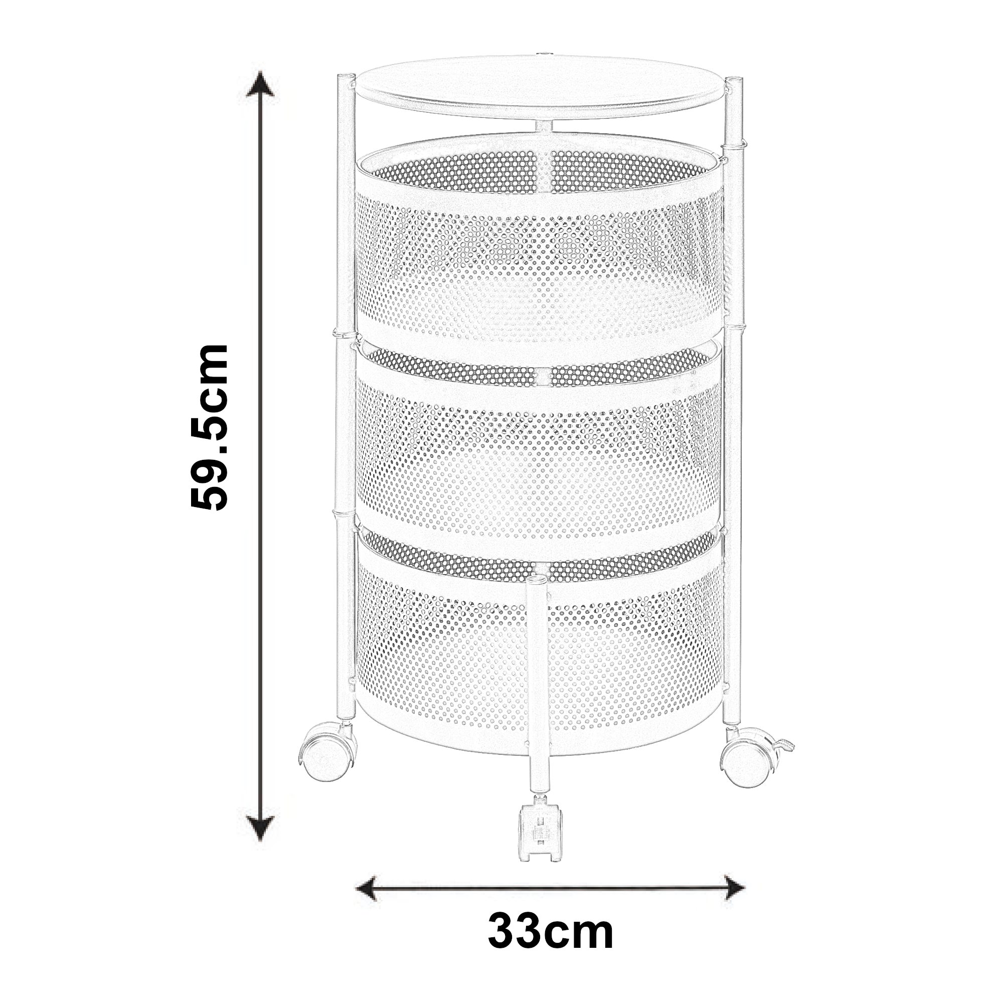 Cele trei coșuri rotunde oferă spațiu suficient pentru vase, băuturi, gustări, produse de îngrijire sau accesorii de birou. Primele două coșuri sunt rabatabile, ceea ce îți permite acces rapid la obiecte și o depozitare mai comodă. Designul simplu și modern se integrează ușor în diferite stiluri de amenajare.