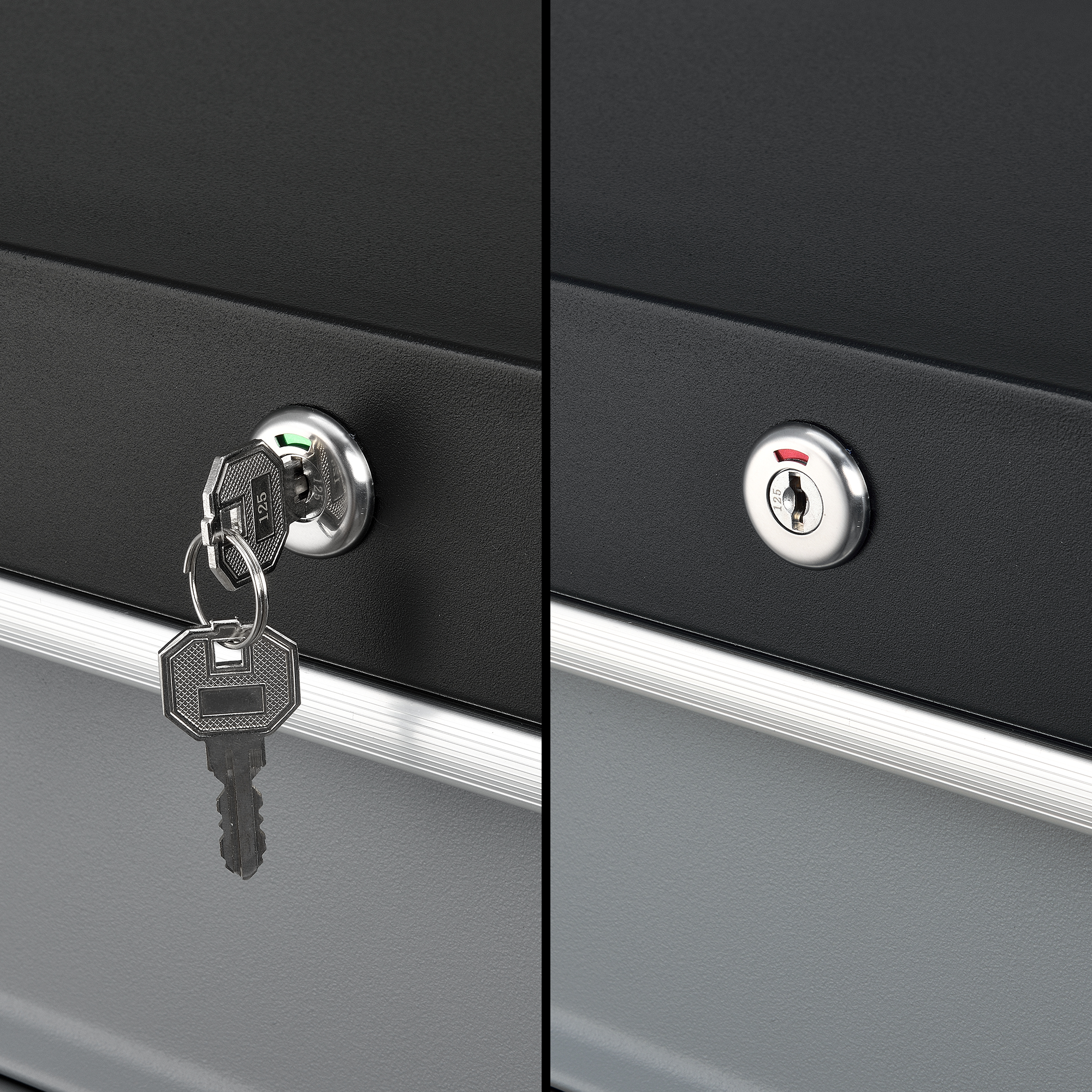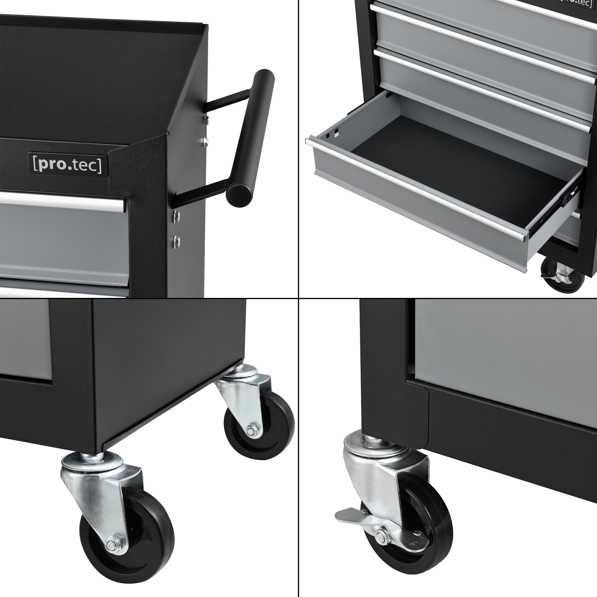 Acest dulap mobil pentru scule păstrează uneltele bine ordonate și ușor accesibile. Sertarele se pot încuia cu ajutorul unui cilindru cu cheie, pentru protecție împotriva accesului neautorizat și pentru a preveni deschiderea accidentală în timpul deplasării. Mânerul lateral poate fi montat pe stânga sau pe dreapta, în funcție de preferințe.