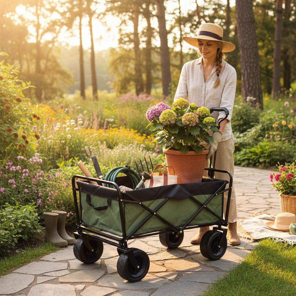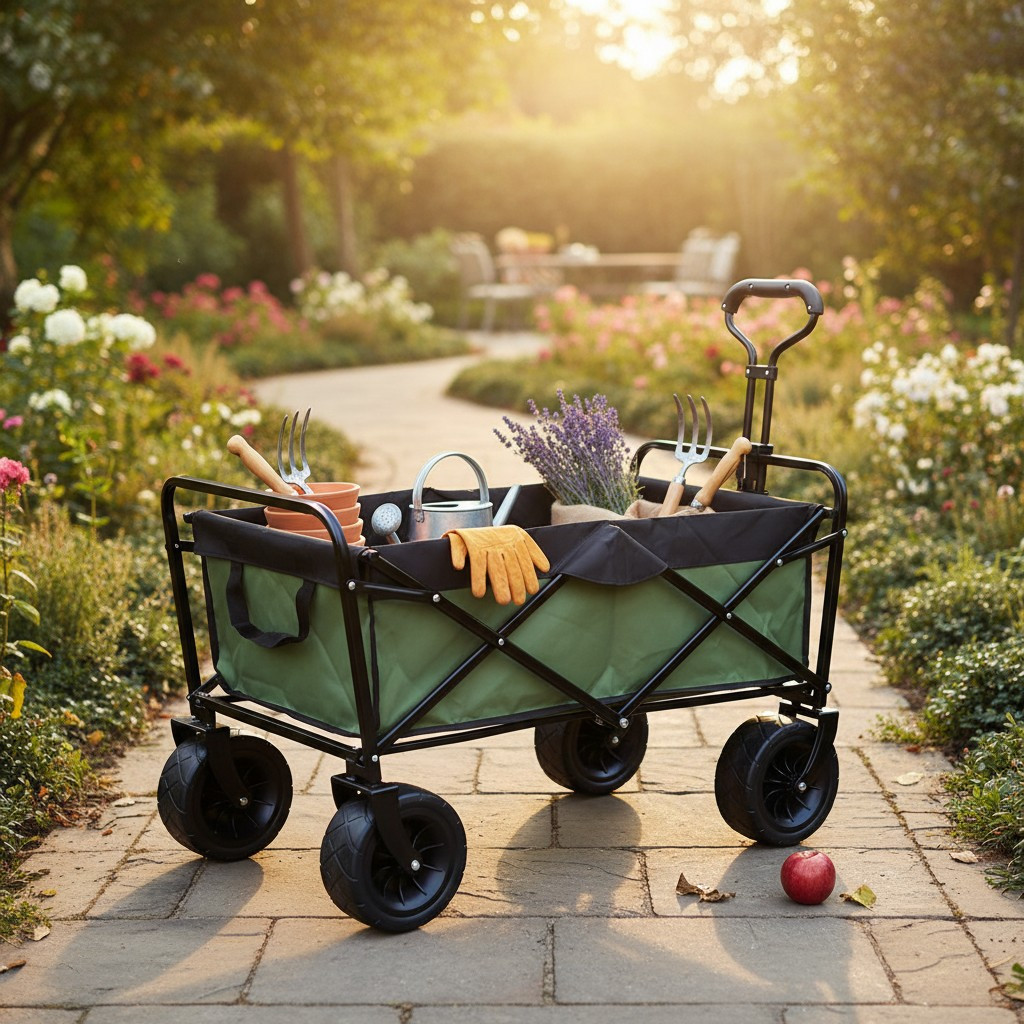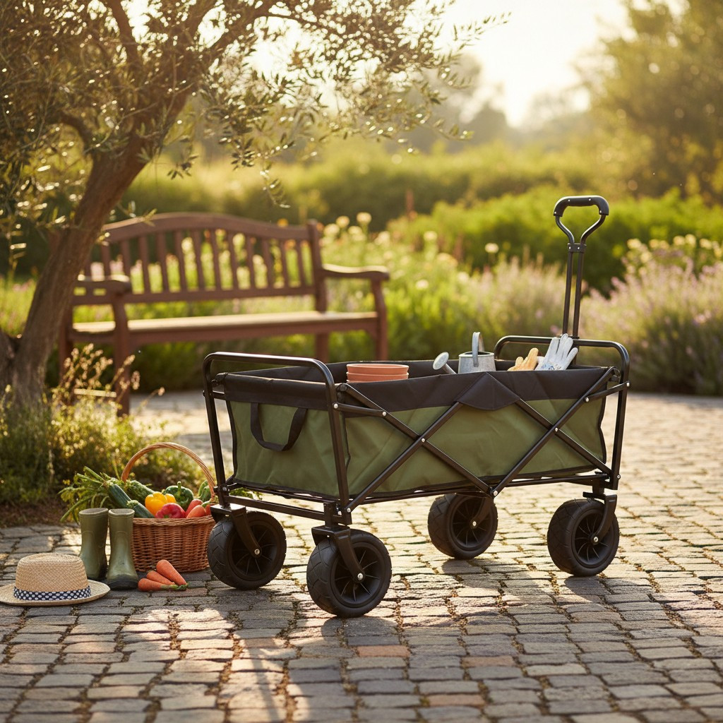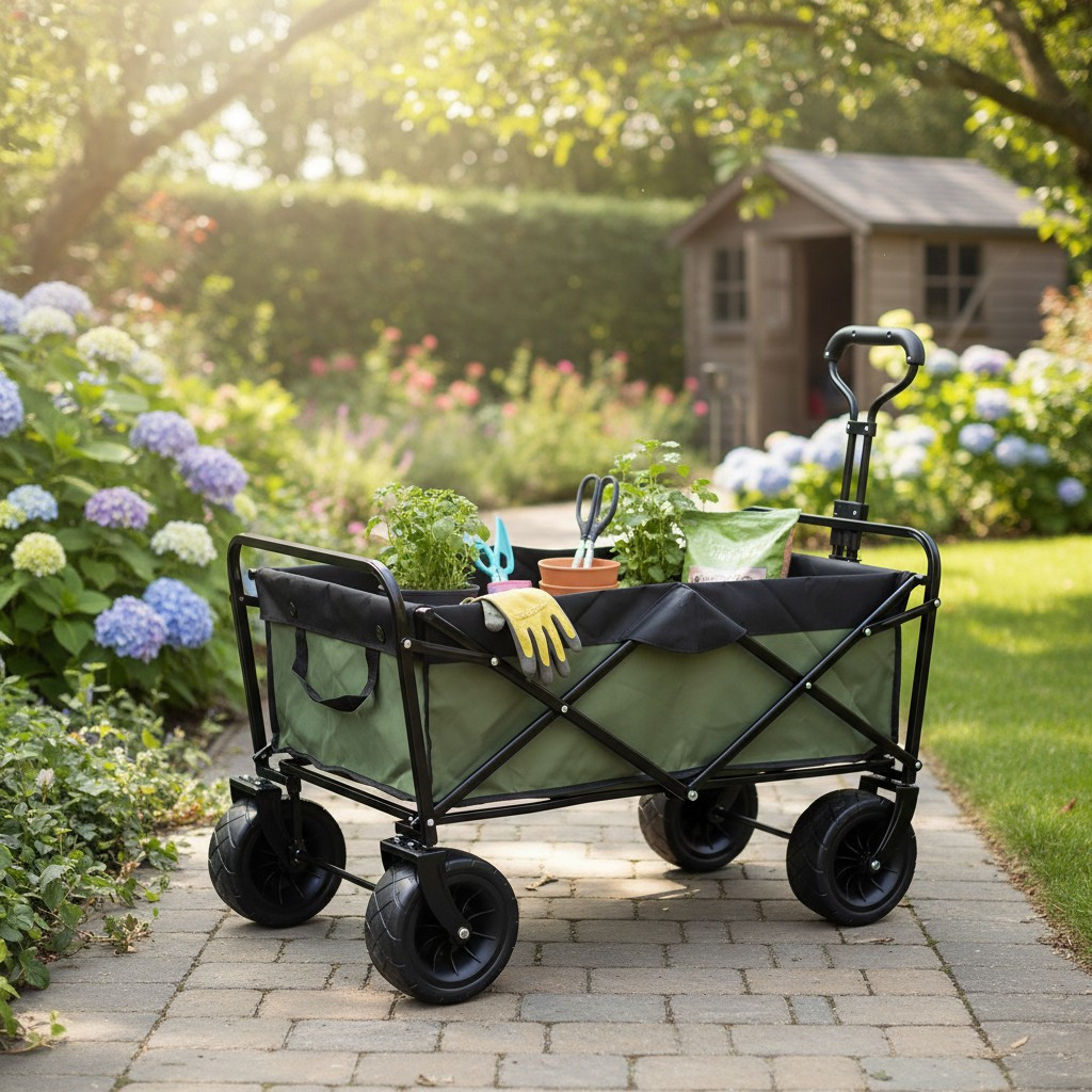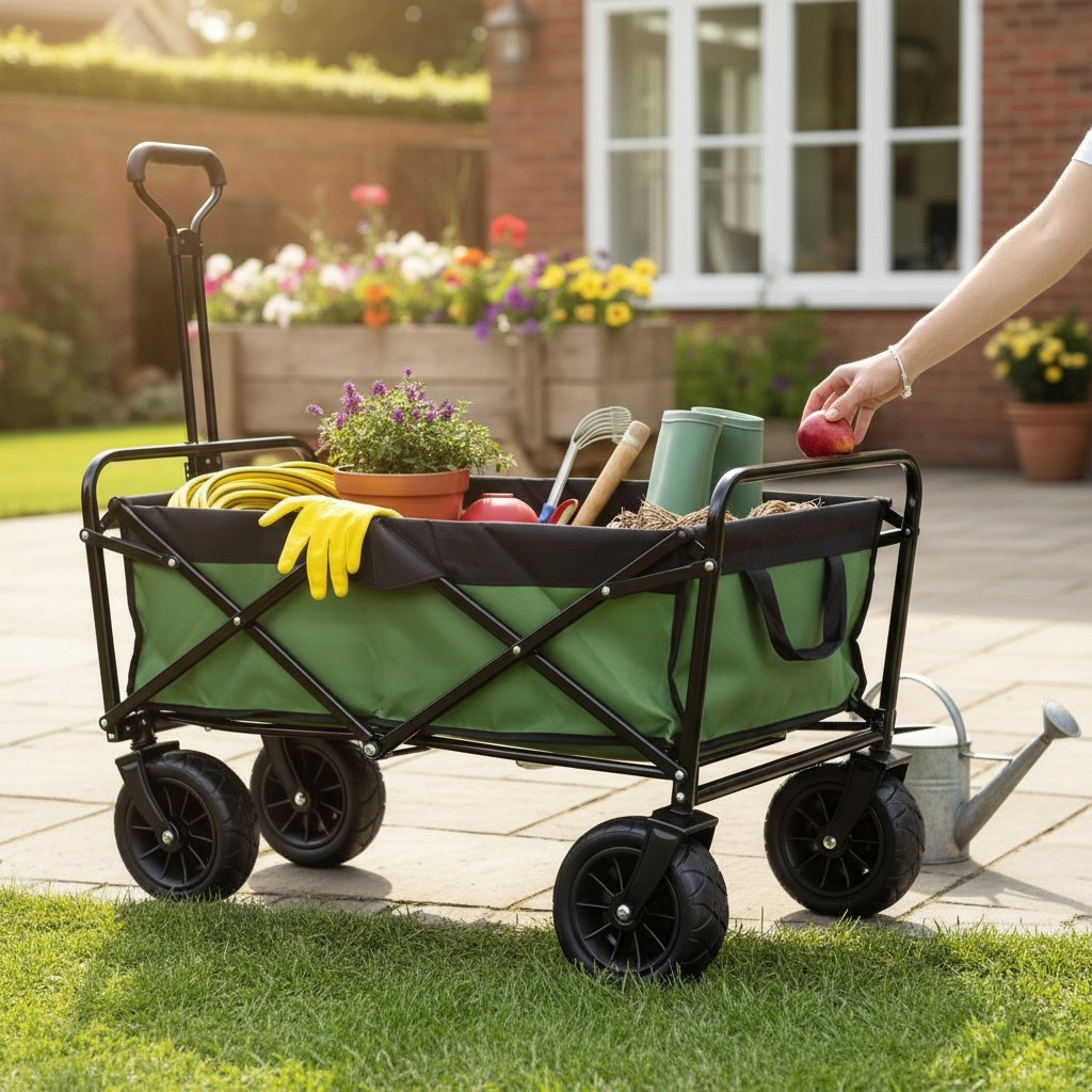 Caruciorul pliabil pentru gradina te ajuta sa muti rapid si in siguranta unelte, saci cu pamant, ghivece, lemne sau cumparaturi voluminoase. Are un cadru din otel pentru stabilitate, iar husa textila detasabila se curata usor dupa utilizare.