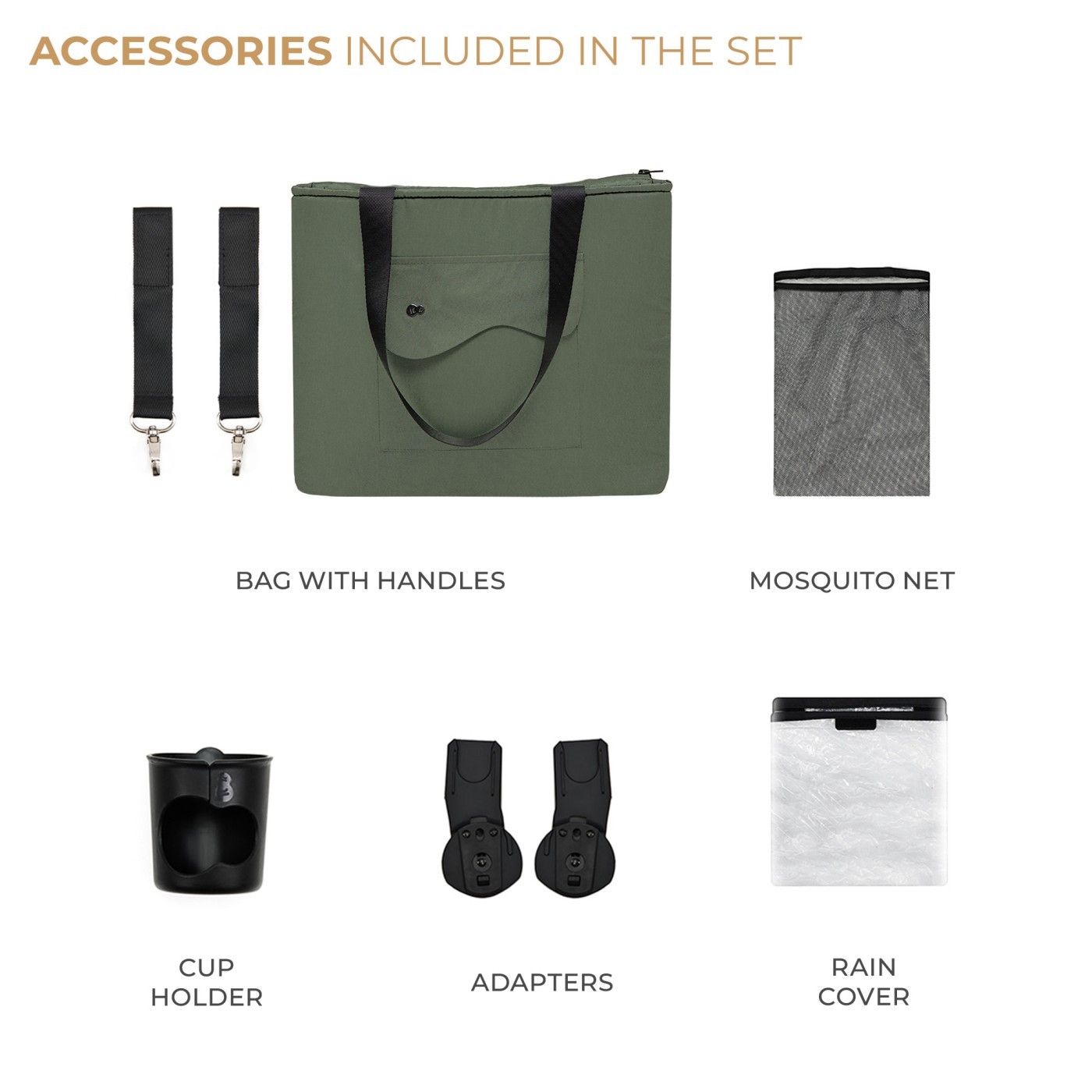 - Accesorii incluse: husă de ploaie, suport pentru pahar, geantă pentru părinte, adaptoare pentru scaun auto