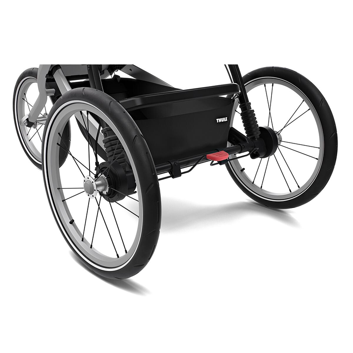 Roata frontală fixă de 16 inch și roțile spate mari de 18 inch sunt optimizate pentru alergare și deplasare lină pe diverse suprafețe. Frâna de mână acționată pe cablu permite control bun al vitezei pe teren denivelat, iar suspensia spate și roțile gonflabile contribuie la un plus de confort în timpul plimbărilor zilnice.
