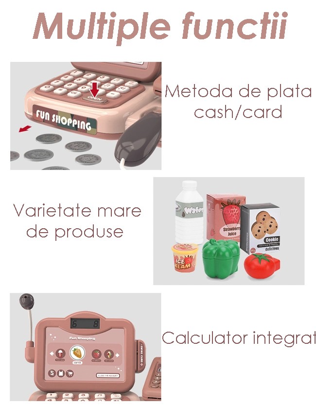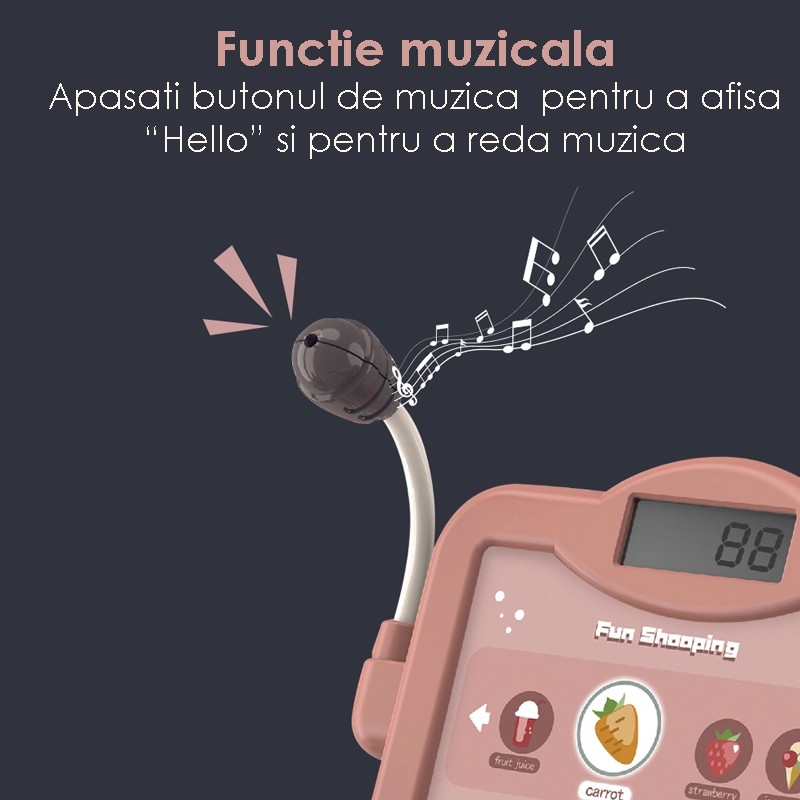 - Funcții: scanner produse, microfon pentru anunțuri, efecte sonore, muzică (23 melodii)