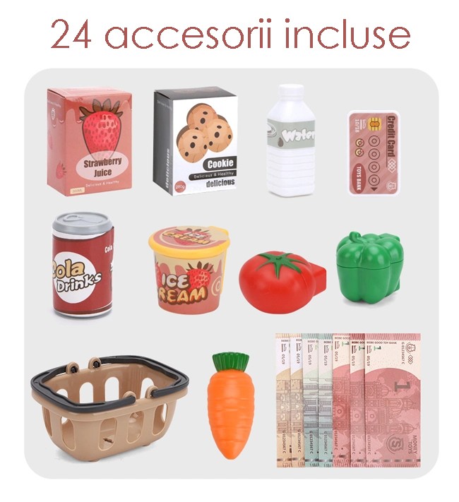 - Accesorii: 24 piese (coș cumpărături, legume, sticlă apă, 2 sucuri, cutie înghețată, cutie fursecuri, 6 monede, 7 bancnote, card)