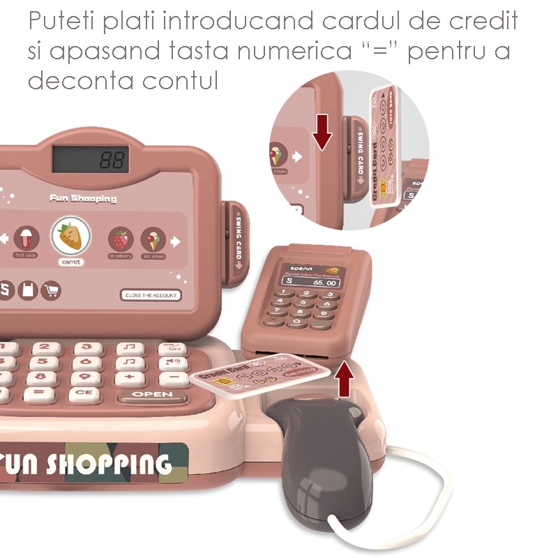 Cum se folosește: așezați produsele în coș, scanați-le cu scannerul, introduceți suma pe „calculator” și finalizați plata cu monede/bancnote sau cu cardul de jucărie. Funcționează cu 3 baterii AA (neincluse) și se recomandă utilizarea sub supravegherea unui adult.