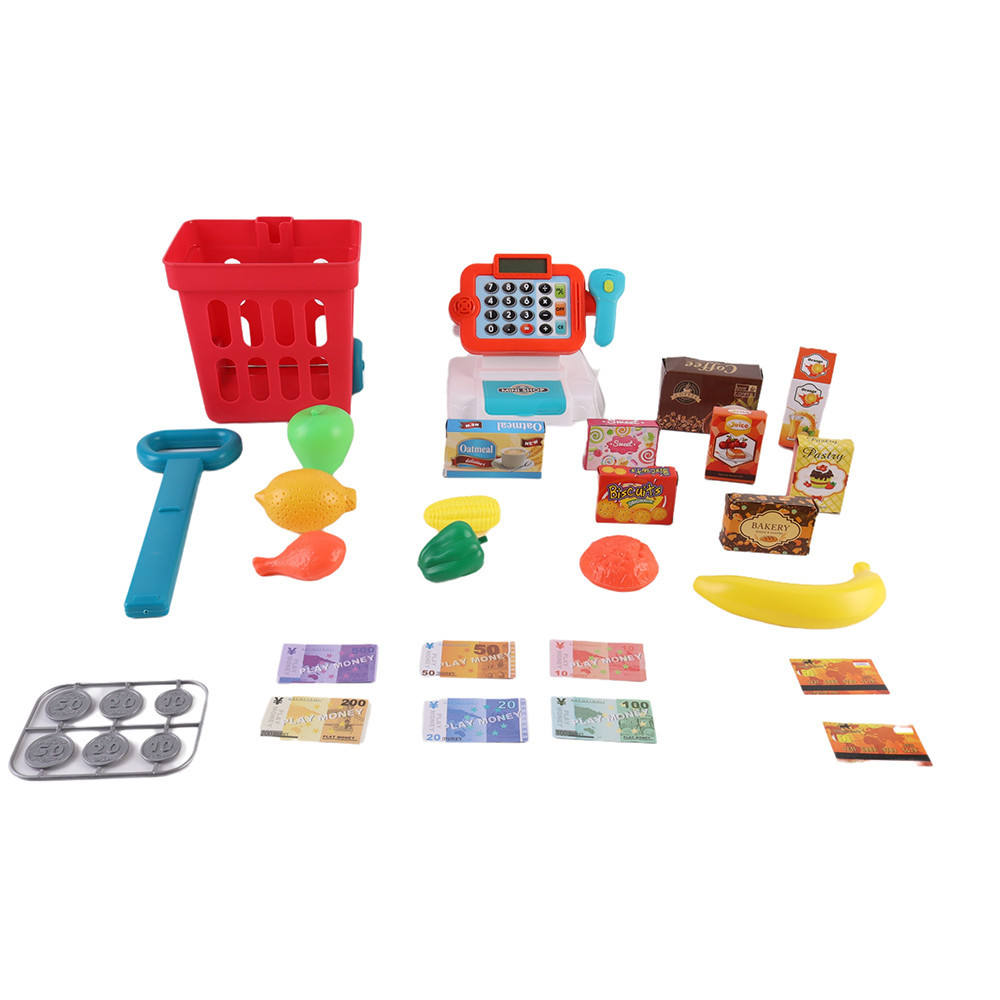 Aranjează produsele în cărucior, scanează la casă cu cititorul de coduri, calculează totalul cu funcția de tip calculator și plătește cu banii de jucărie. Setul este ideal pentru joacă individuală sau împreună cu familia și prietenii.