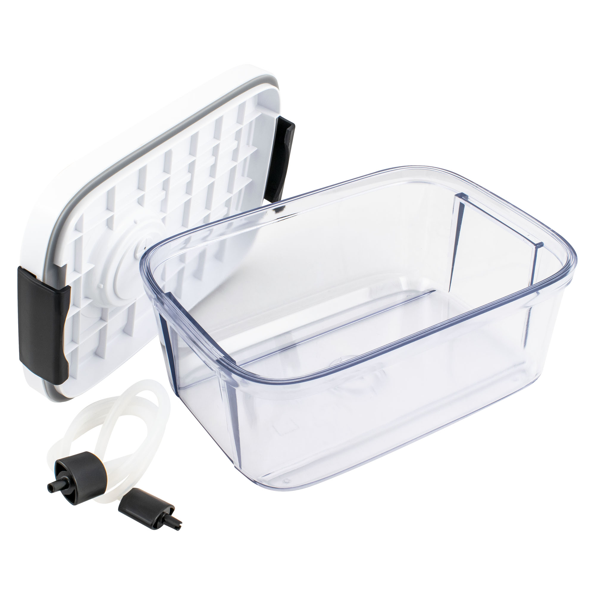 Utilizare: Caserola se poate folosi pentru depozitarea alimentelor proaspete sau gătite, porțiilor pregătite din timp, fructelor ori deserturilor. Se conectează prin furtun la un aparat de vidat compatibil, pentru extragerea aerului și conservare eficientă. Capacul nu se introduce în cuptorul cu microunde.