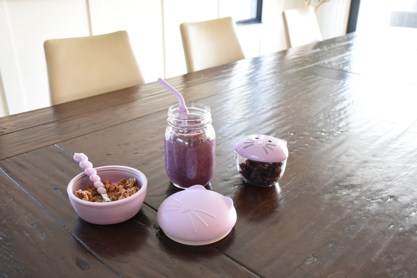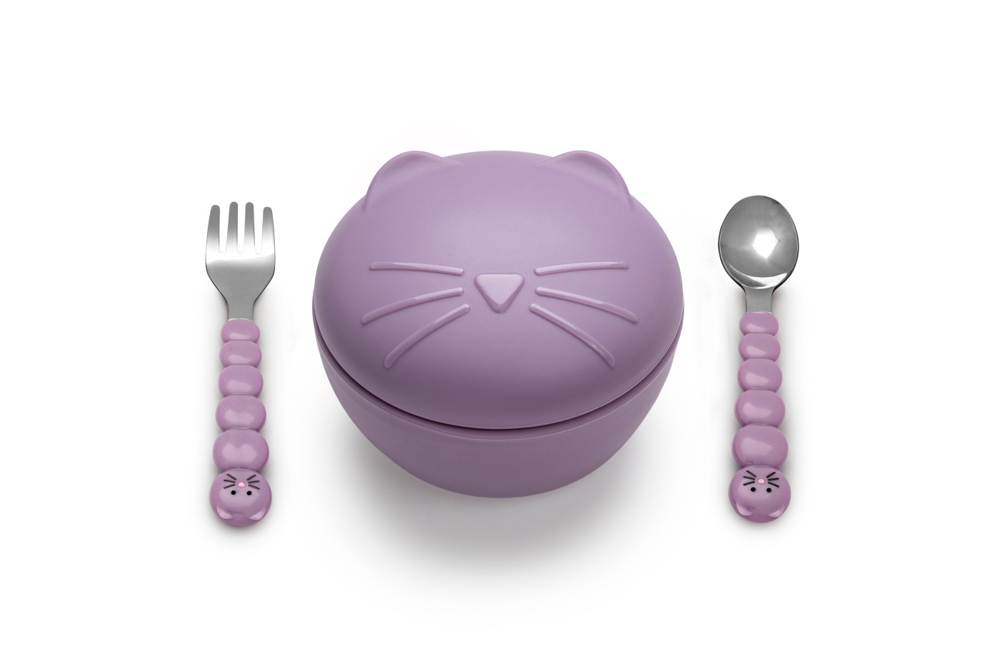 Castron din silicon cu capac și tacâmuri Melii, model pisică, mov
