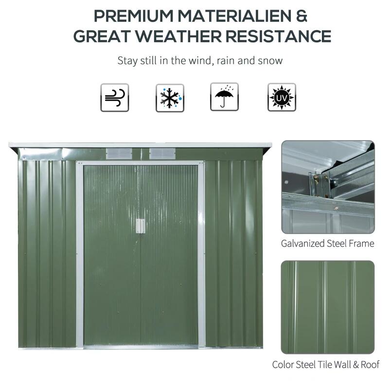- Acoperisul si peretii sopronului de gradina sunt realizate din tigle de otel colorate, in timp ce fundatia este din otel galvanizat care protejeaza magazia de insecte si umiditatea solului.