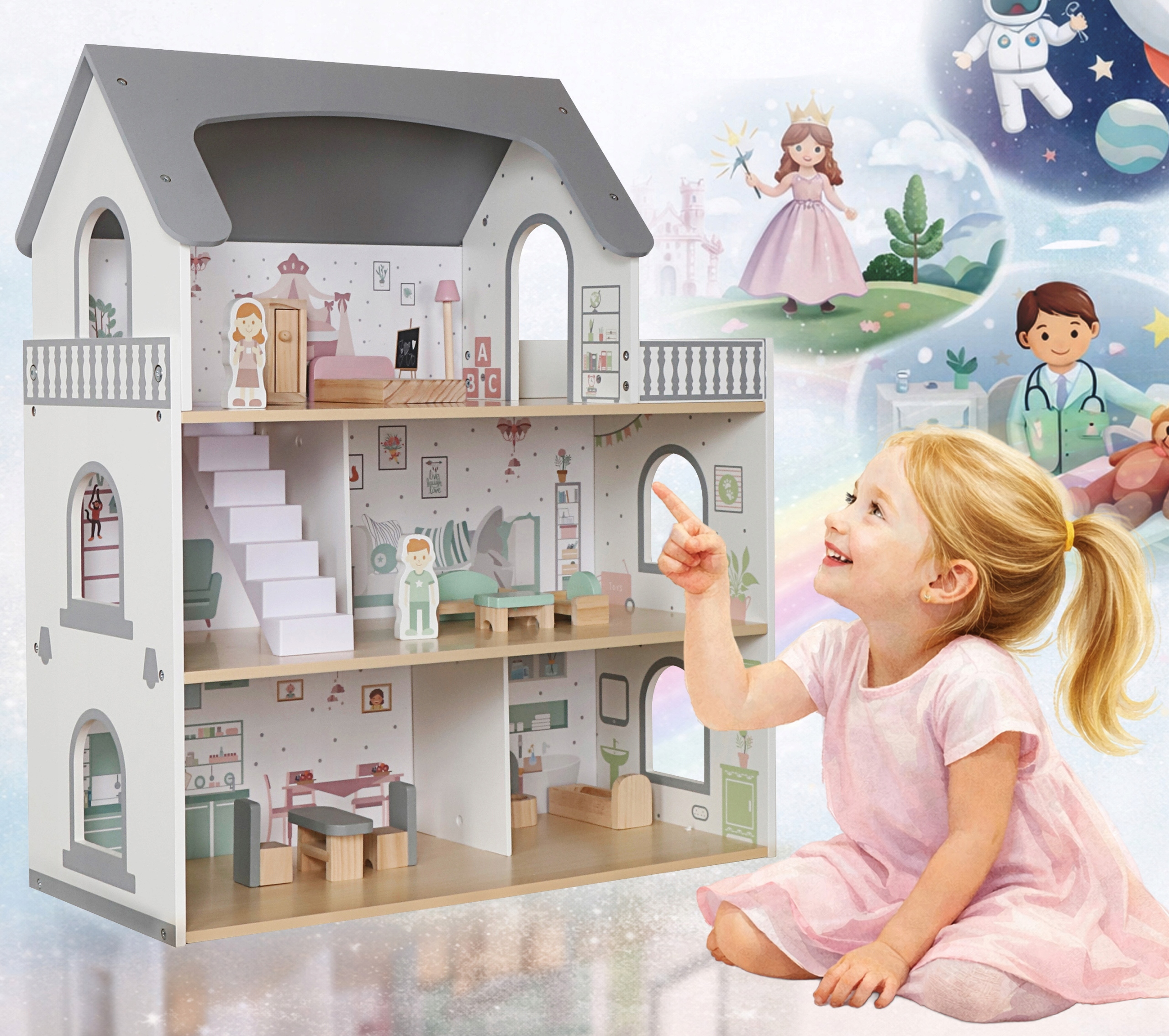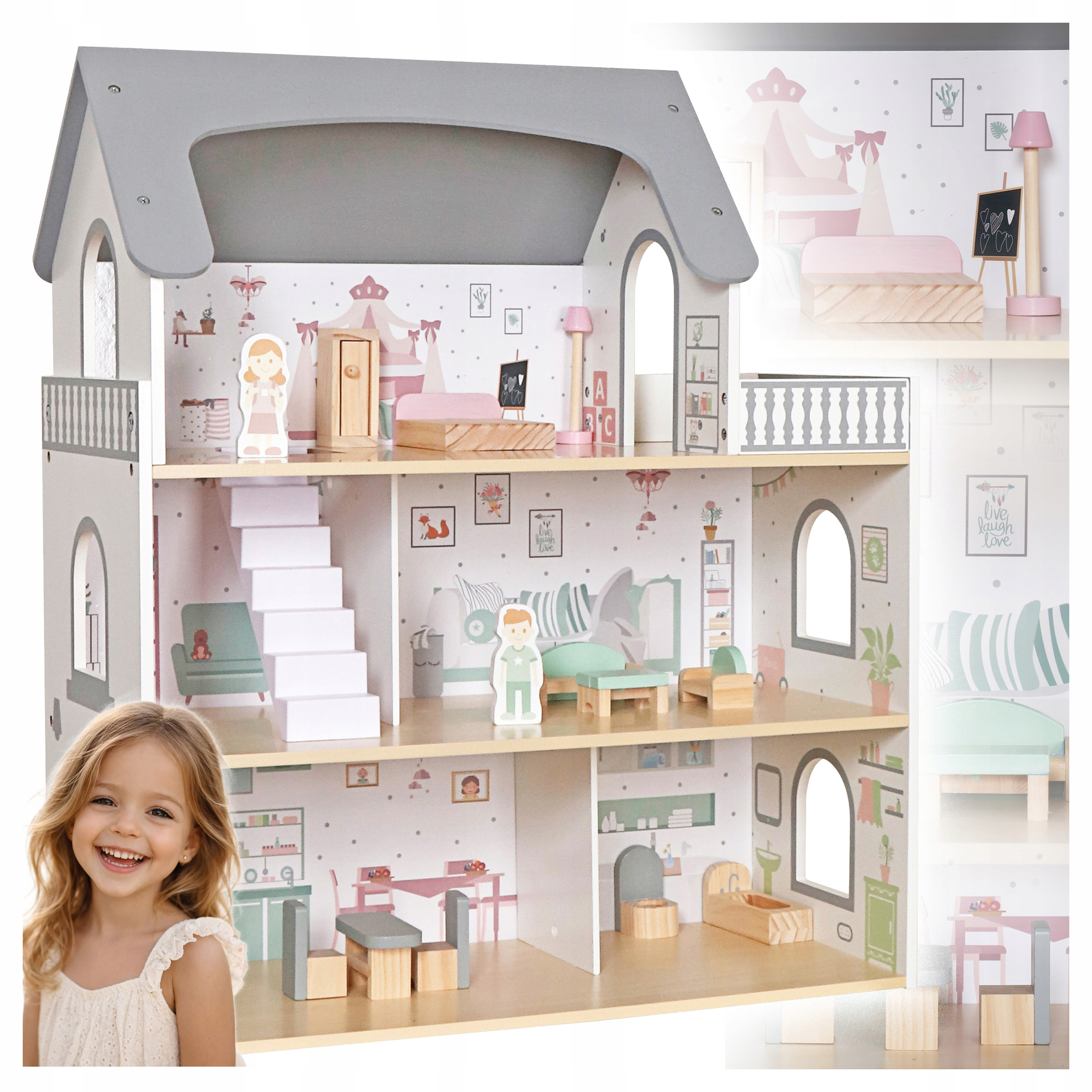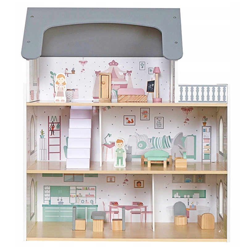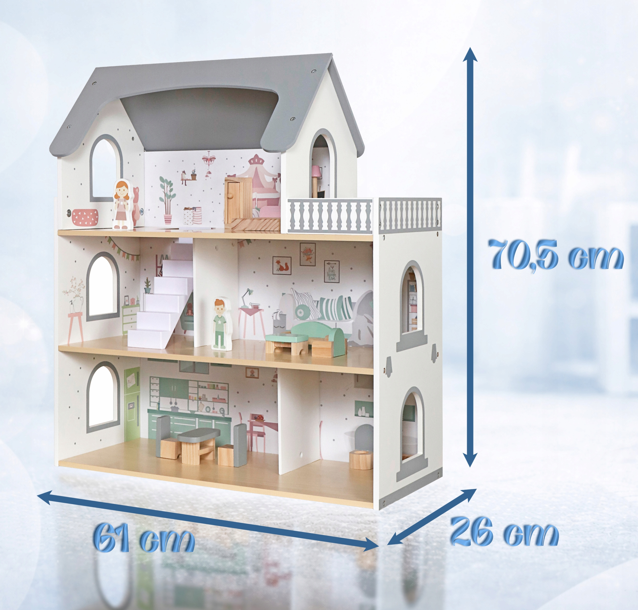 Casuta pentru papusi din lemn cu 3 niveluri, mobilier si accesorii, 61x26x71 cm, multicolor