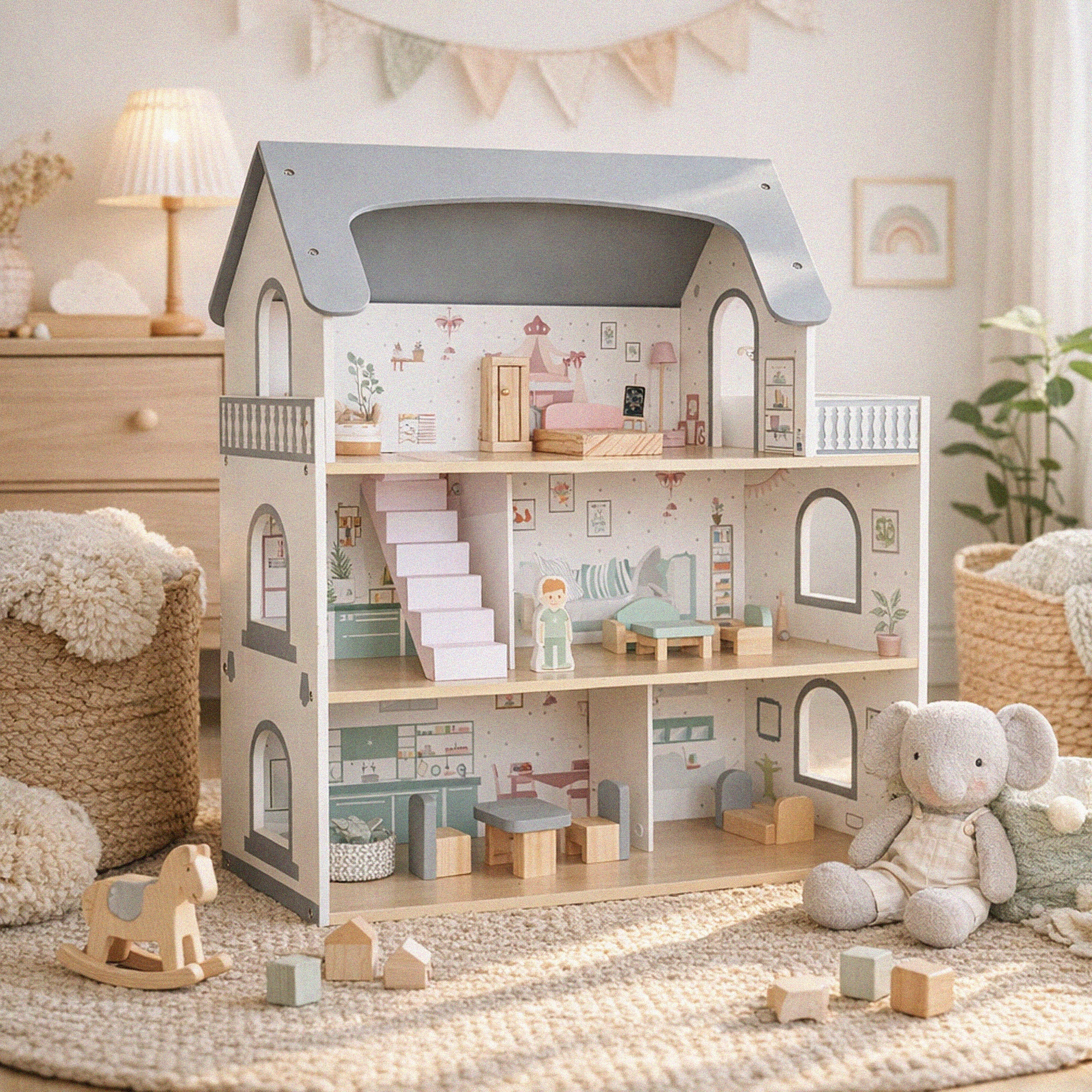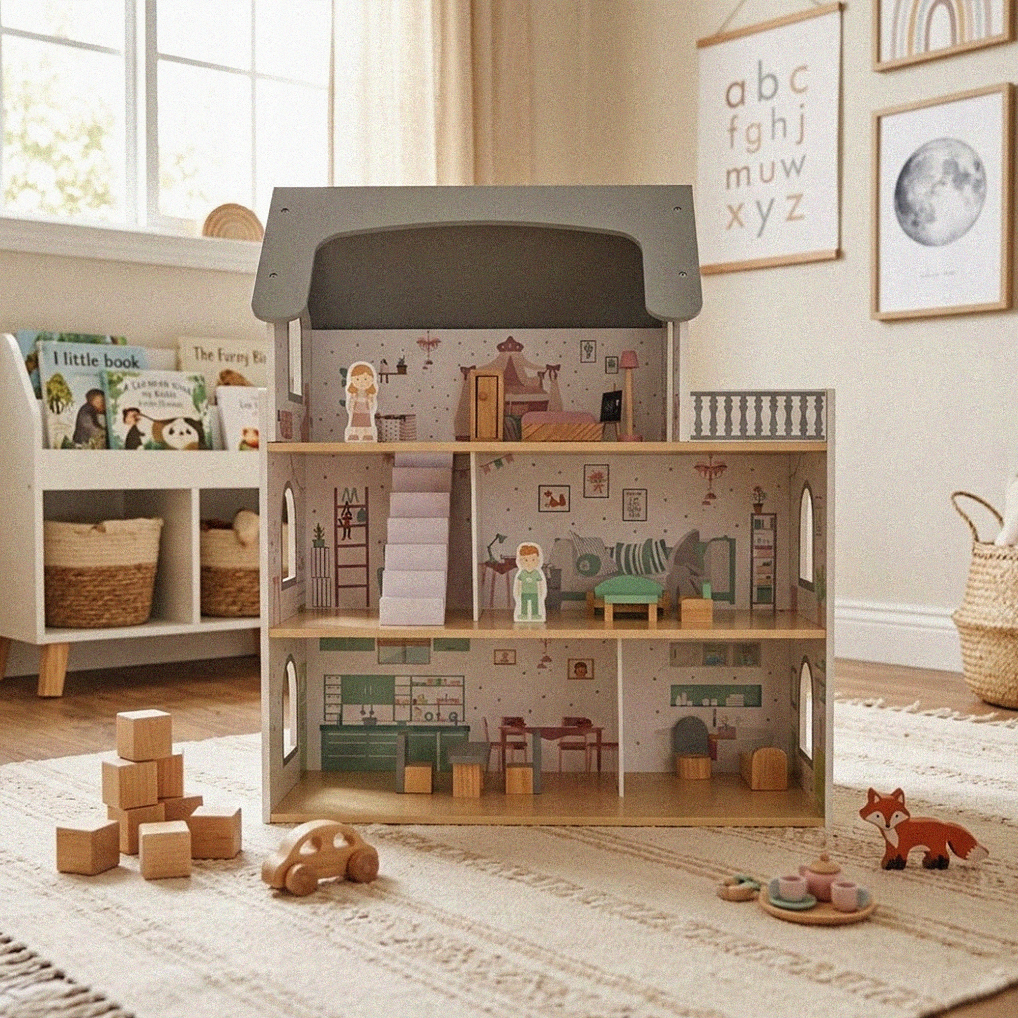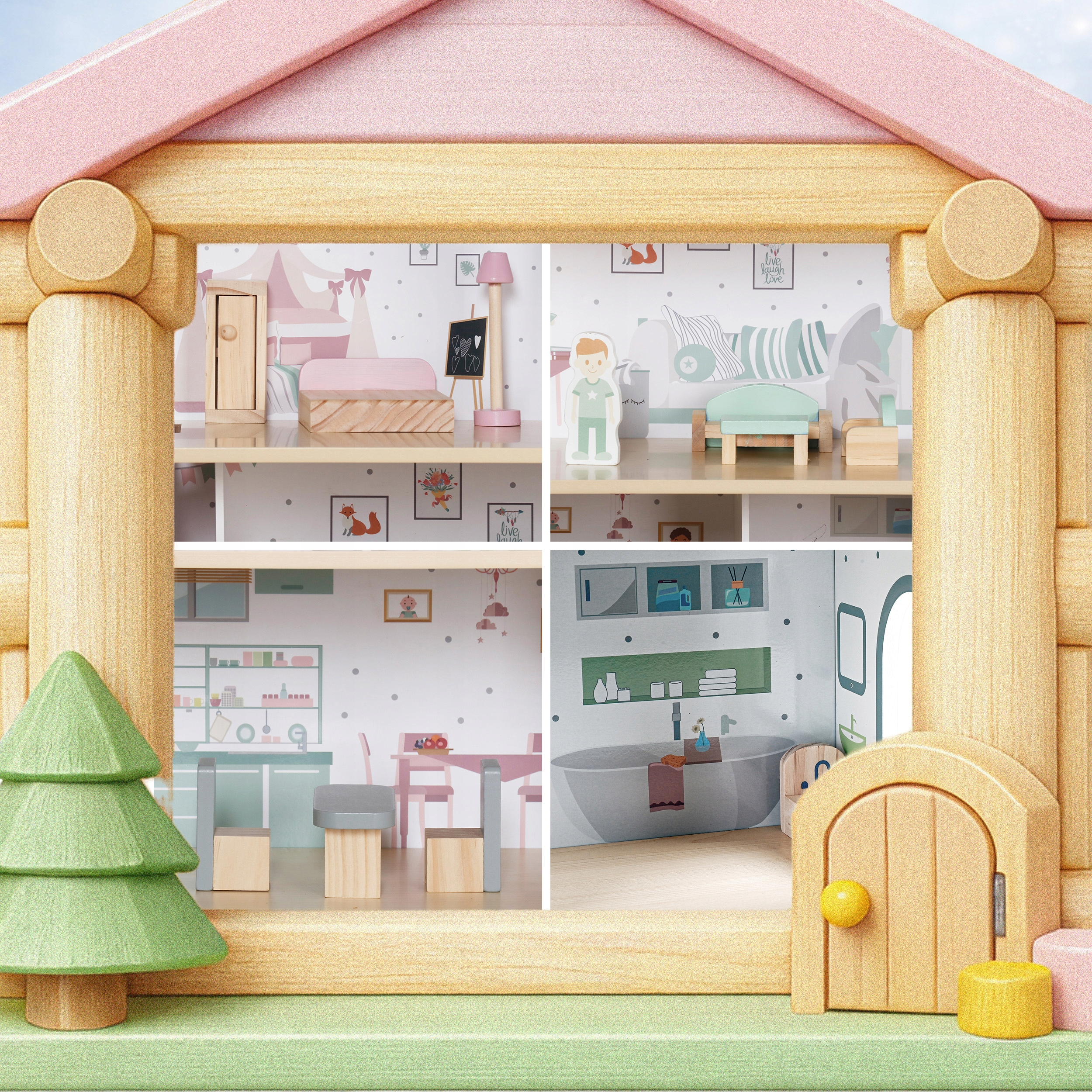 Casuta pentru papusi din lemn cu 3 niveluri, mobilier si accesorii, 61x26x71 cm, multicolor
