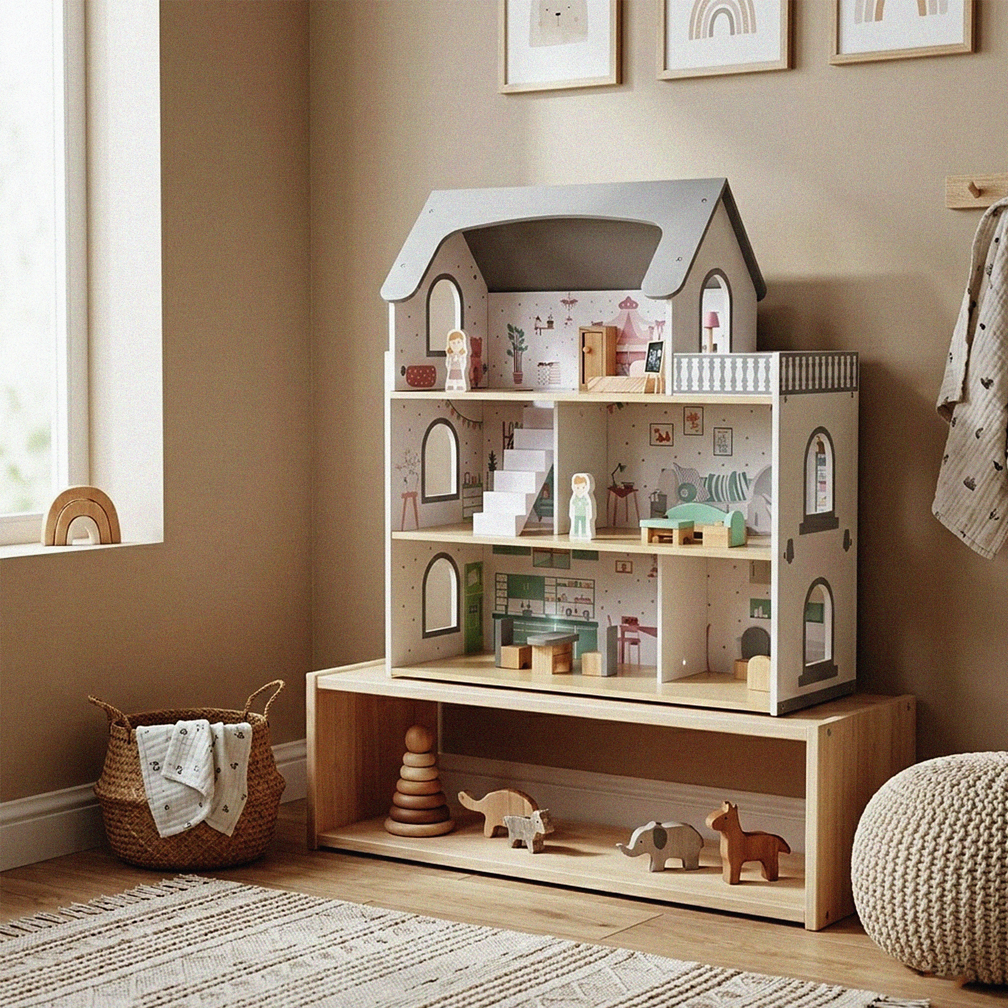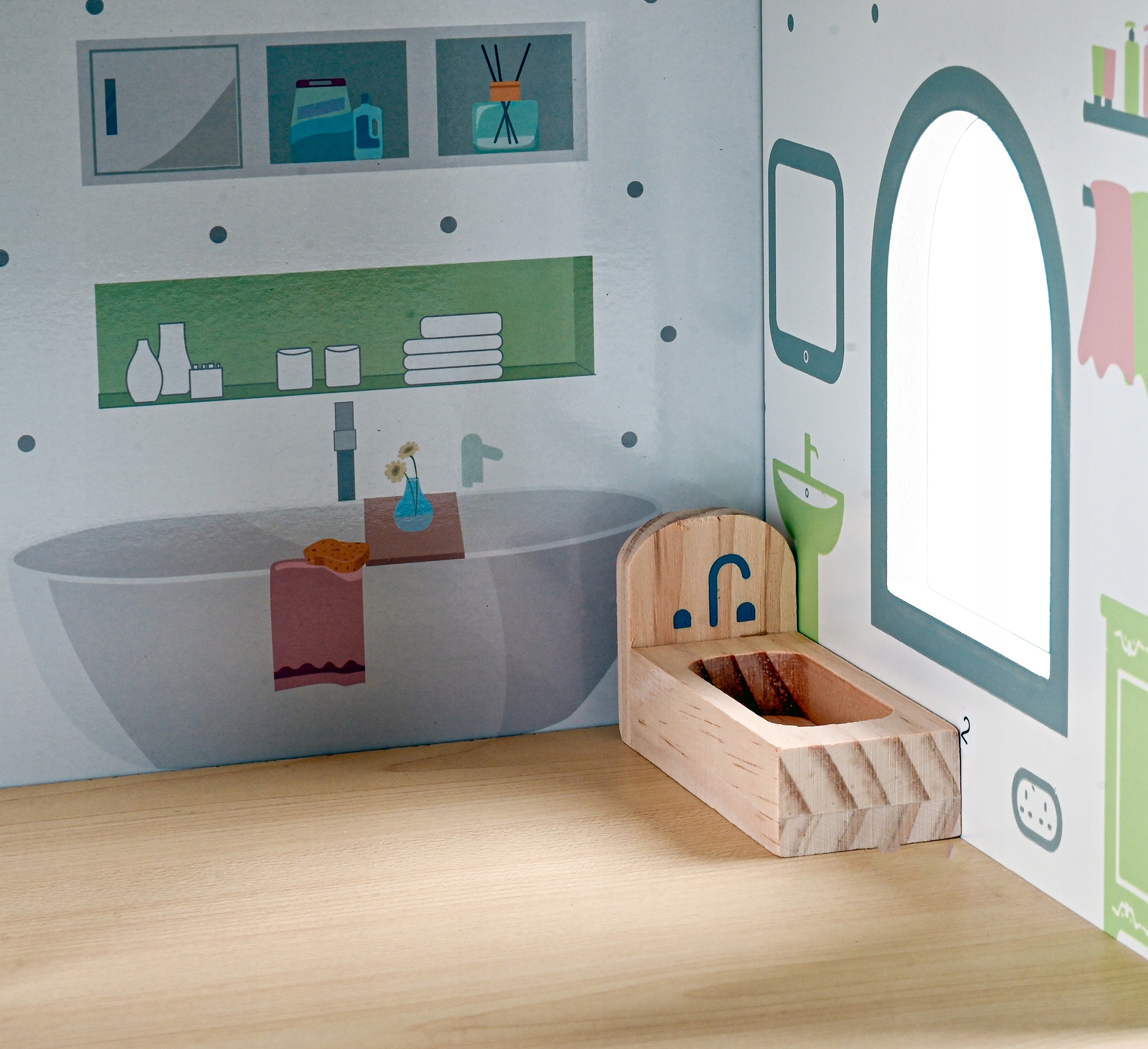 Descriere Casuta papusi lemn 3 niveluri, mobilier