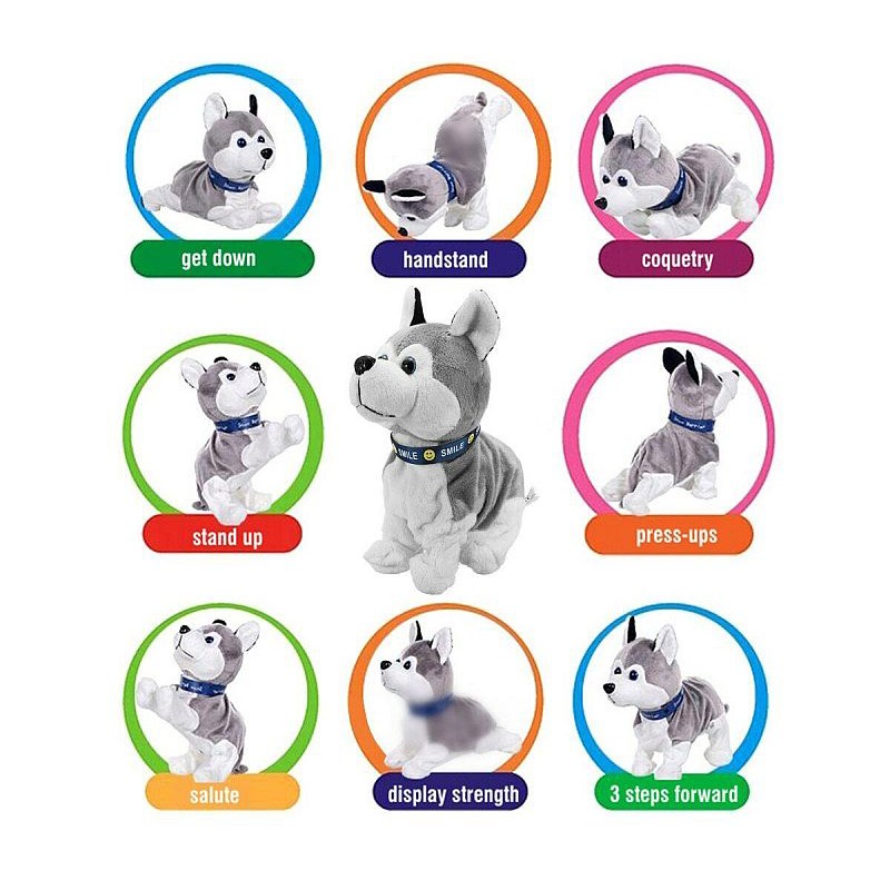 Aceasta jucarie este fara indoiala o alegere inspirata pentru copii, catelusul interactiv reactioneaza in interactiunea cu copilul prin diverse sunete si miscari realiste. Catelul Husky este realizat din plus moale si placut la atingere, insa functiile sale il deosebesc de jucariile traditionale. Atunci cand copilul il mangaie, catelul reactioneaza la atingerea acestuia si se comporta ca un patruped adevarat. Pe spatele acestuia se afla pozitionat un senzor care odata atins activeaza efectele sonore si miscarea cainelui. Acesta poate latra, se intinde pe burtica, sta in pozitia sezut, culcat si se ridica in doua labute. Reactioneaza la mangaierile copilului, adulmeca asemenea unui catel real, maraie, plange, etc.