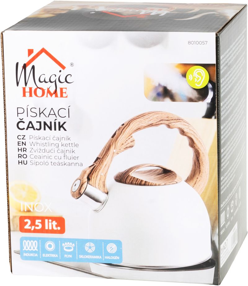 Ceainicul fluierător MagicHome alb de 2,5 litri este alegerea ideală pentru pregătirea rapidă a băuturilor calde în orice bucătărie. Cu un design modern, finisaj elegant și detalii cu aspect de lemn pe mâner și capac, acest ceainic pentru aragaz îmbină utilul cu estetica într-un mod plăcut și practic.