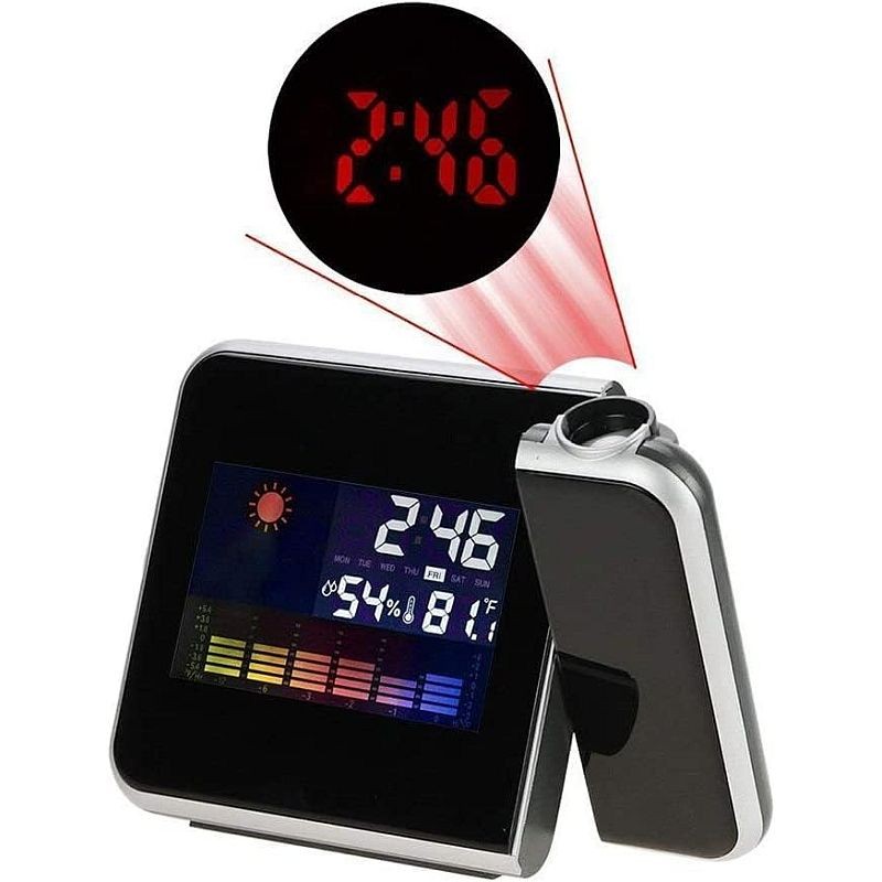 Ceasul de birou multifunctional cu ecran digital este prevazut in partea dreapta cu un mic proiector LED care este mobil si care poate proiecta pe perete sau pe tavan ora, putand fi rotit la 180 grade in orice directie doriti. Proiectia este destul de luminoasa si poate fi observata chiar si in timpul zilei. Pentru a proiecta ora pe tavan, functia de lumina de fundal trebuie sa fie activata.