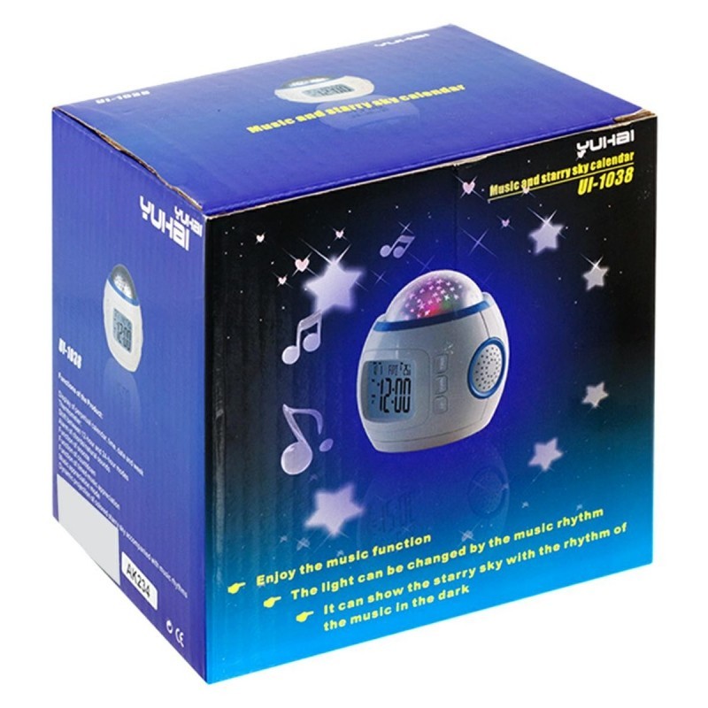 Ceasul de birou dispune de LED-uri incorporate (albastru, rosu, verde), caracteristica principala a acestui ceas fiind proiectia de stele pe tavan sau pe perete. Atunci cand va pregatiti de somn, puteti activa proiectorul si sa creati astfel o atmosfera relaxanta in camera, stelele miscandu-se treptat si aducand o senzatie de liniste. Datorita designului compact, acesta de va integra cu usurinta in orice decor al camerei.