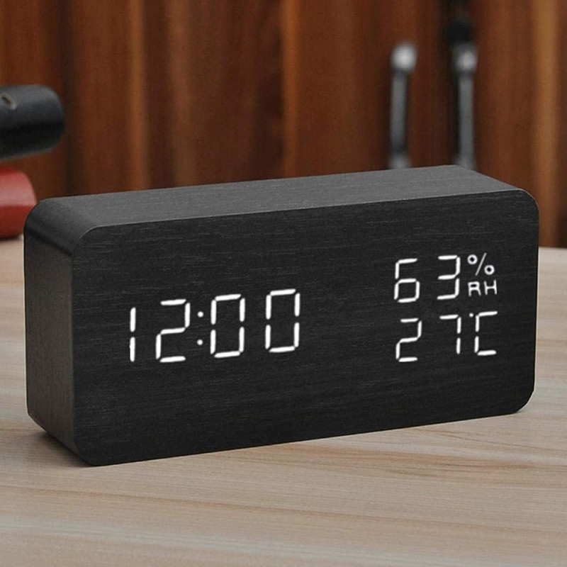 Ceas LED digital de birou cu temperatură/umiditate, 3 alarme, MDF negru
