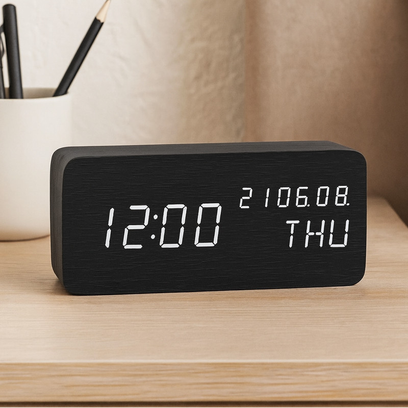 Adaugă un plus de ordine pe birou cu acest ceas LED digital de birou, cu design elegant din MDF negru și afișaj clar. Îți arată rapid ora și informațiile utile despre ambient, iar luminozitatea se ajustează ușor pentru confort zi și noapte.