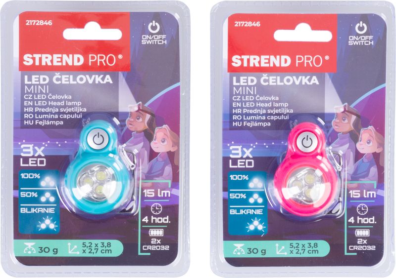 Čelovka Strend Pro Headlight, LED, 15 lm, mini, ružová/modrá, Sellbox 8 ks