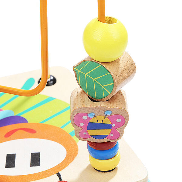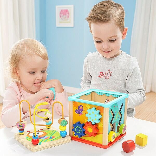 cubul educativ din lemn cu cinci activitati include: sortator cu diferite forme geometrice colorate, un ceas vesel colorat, un labirint cu piese culisante (albinuta si buburuza), un capac cu labirint cu bile colorate si angrenaj cu roti dintate