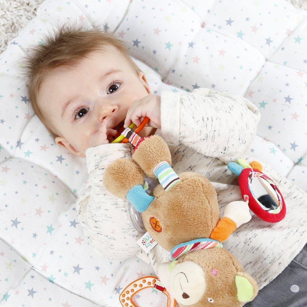 Designul simpatic în formă de ursuleț, materialele plăcute la atingere și elementele interactive transformă această jucărie cu clips pentru bebeluși într-un companion adorabil. Oglinda, zornăitoarea, inelele colorate și piesa pentru dentiție ajută la dezvoltarea motricității fine, a coordonării mână-ochi și a percepției tactile și vizuale.