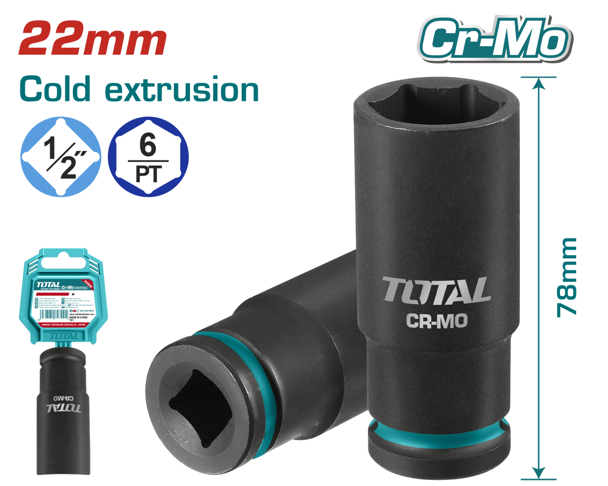 Cheie tubulara de impact TOTAL 22x78 mm, adanca, 1/2 inch, Cr-Mo