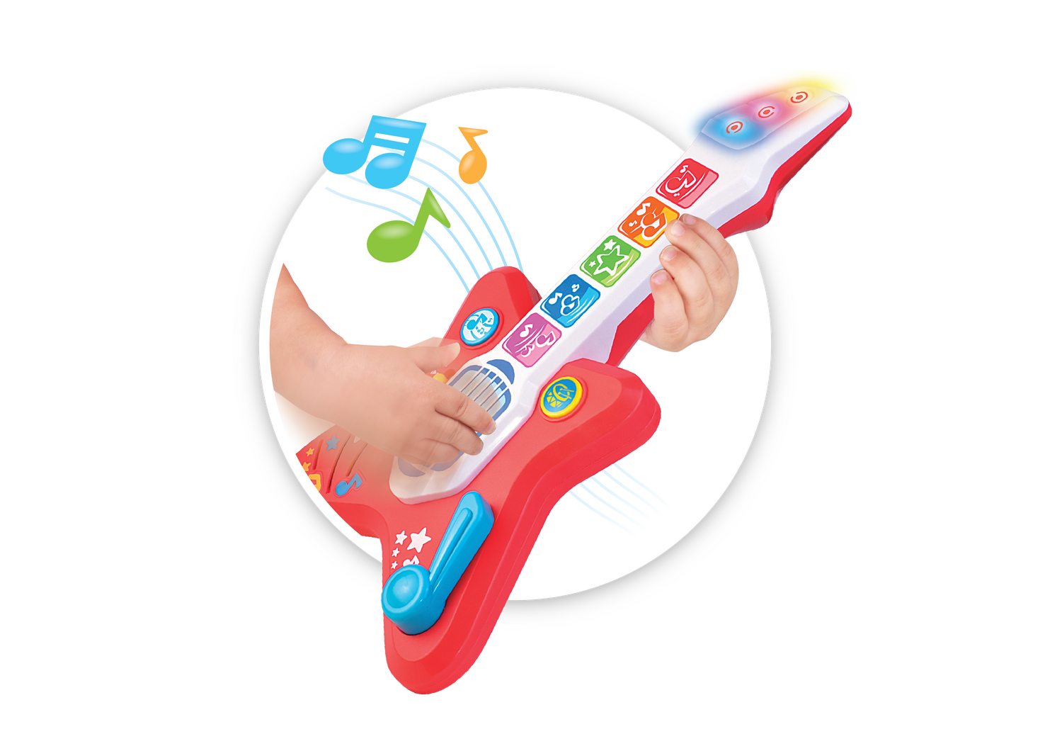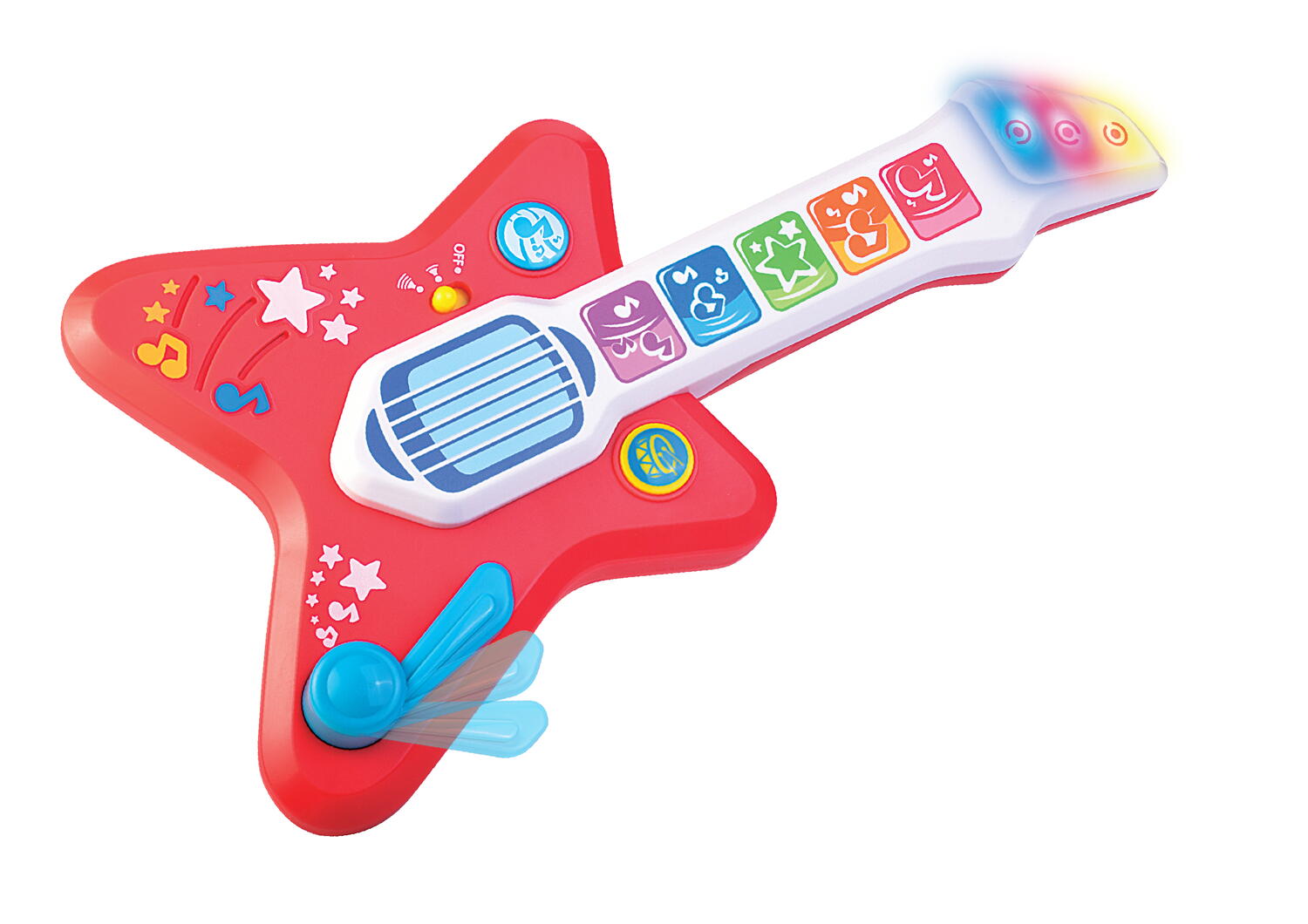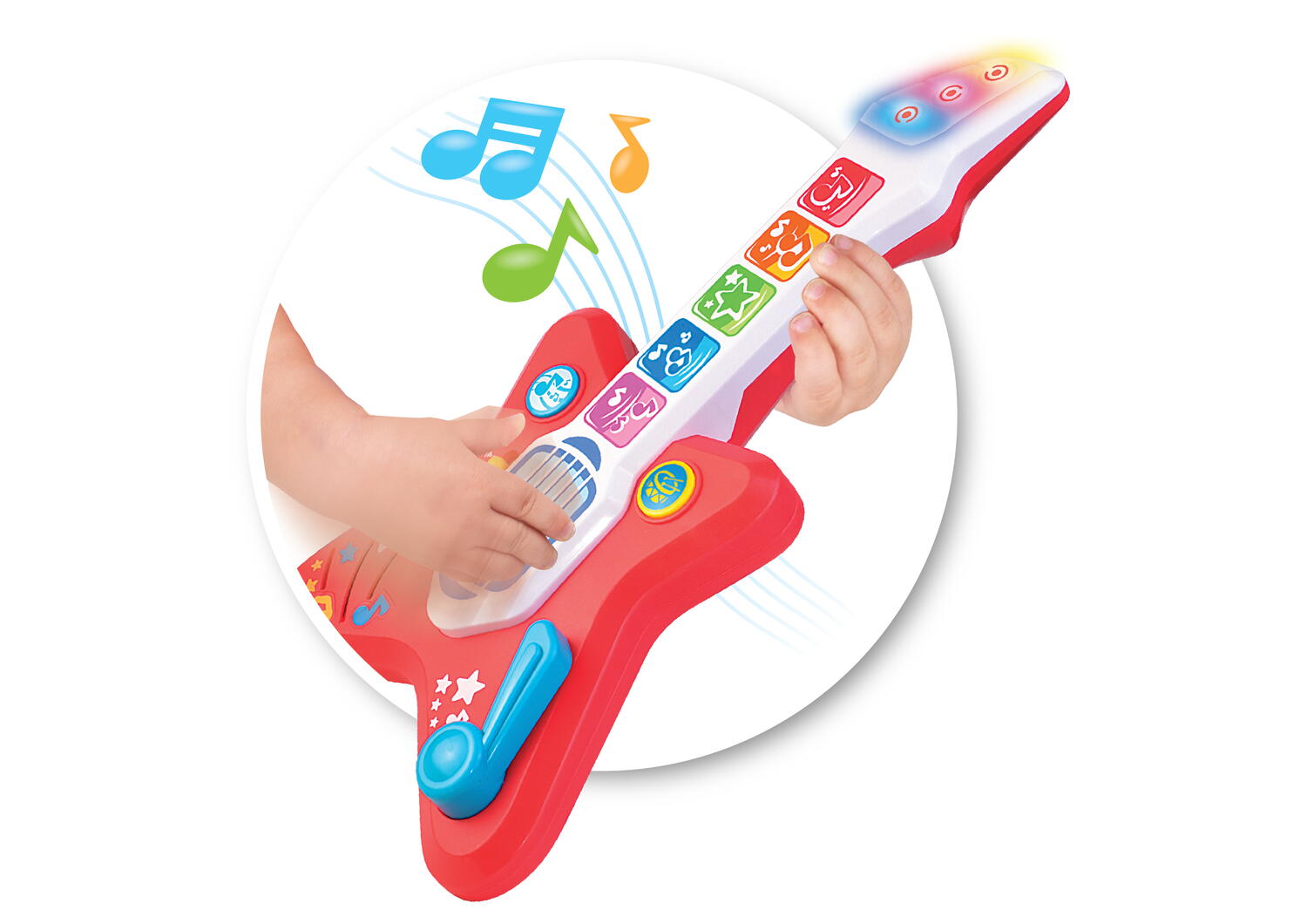 Transformă joaca într-un mic spectacol cu această chitară interactivă pentru copii, creată special pentru micii muzicieni de la 12 luni în sus. Cu lumini atractive, sunete vesele și melodii preînregistrate, jucăria stimulează curiozitatea, dezvoltă simțul auditiv și încurajează creativitatea într-un mod distractiv și prietenos.