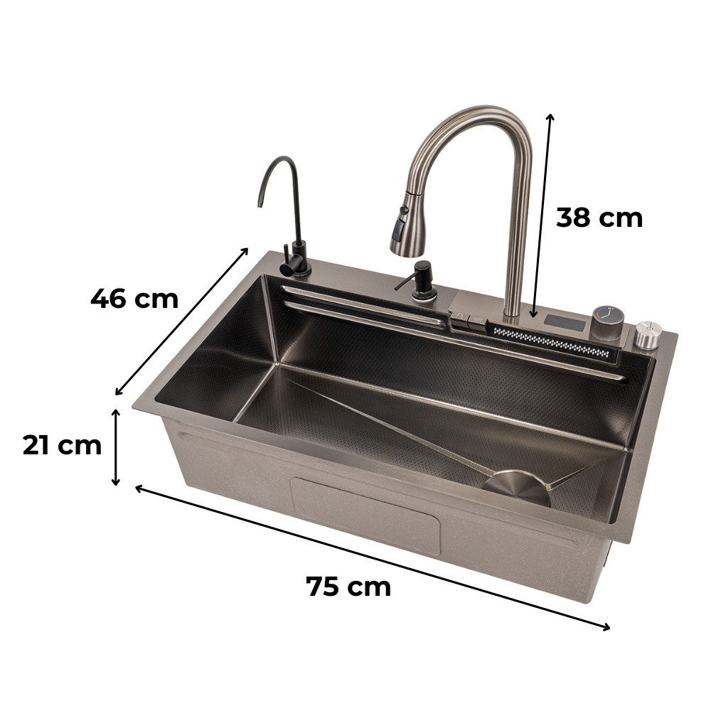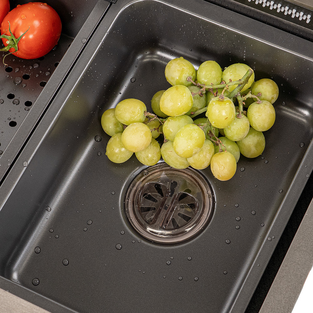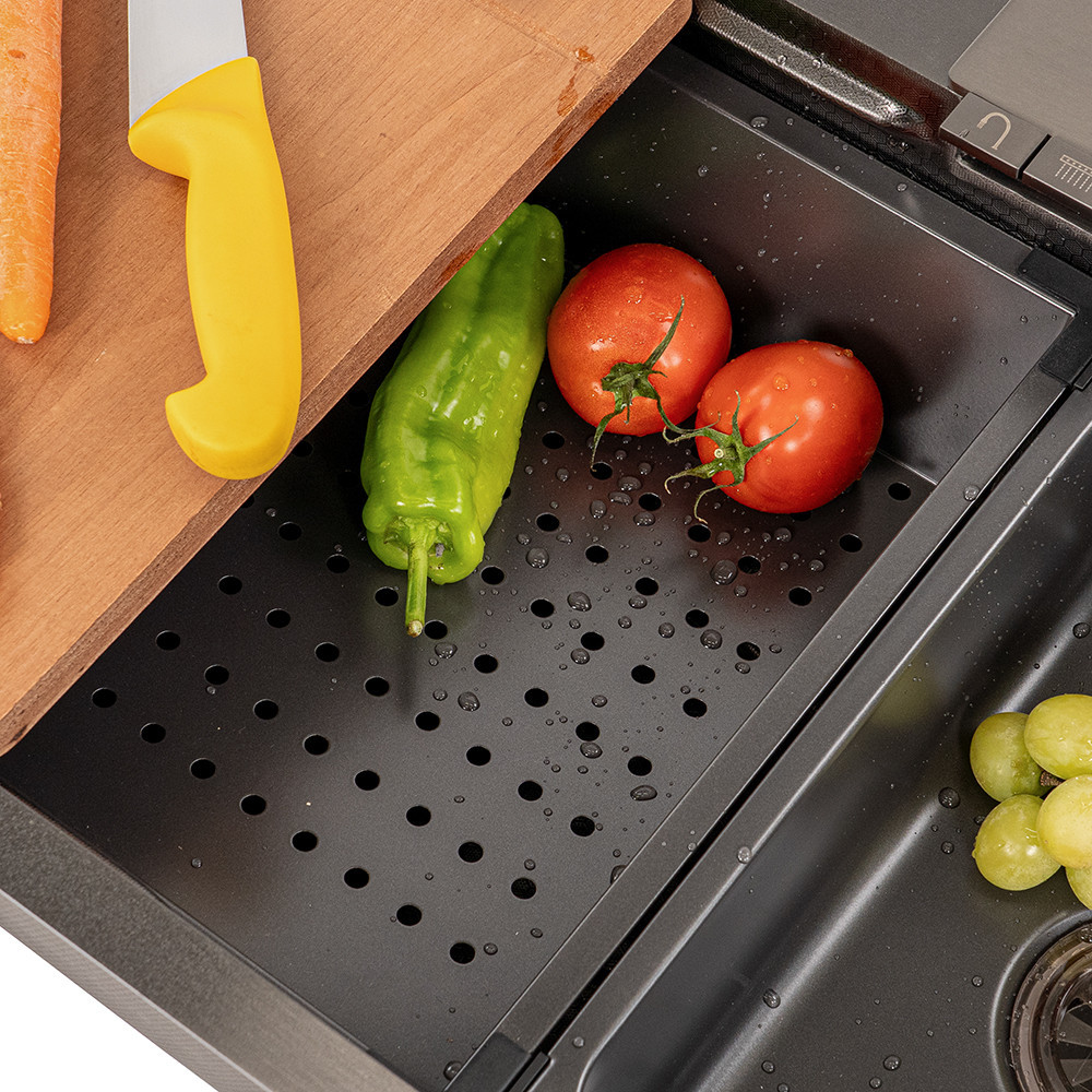 Ideală pentru bucătării din apartamente sau case din România, chiuveta se potrivește în amenajări moderne datorită finisajului negru periat și a accesoriilor. Folosește tocătorul și coșul telescopic pentru pregătirea rapidă a legumelor, iar setul de scurgere și coșul de scurgere te ajută să menții zona curată și bine organizată.