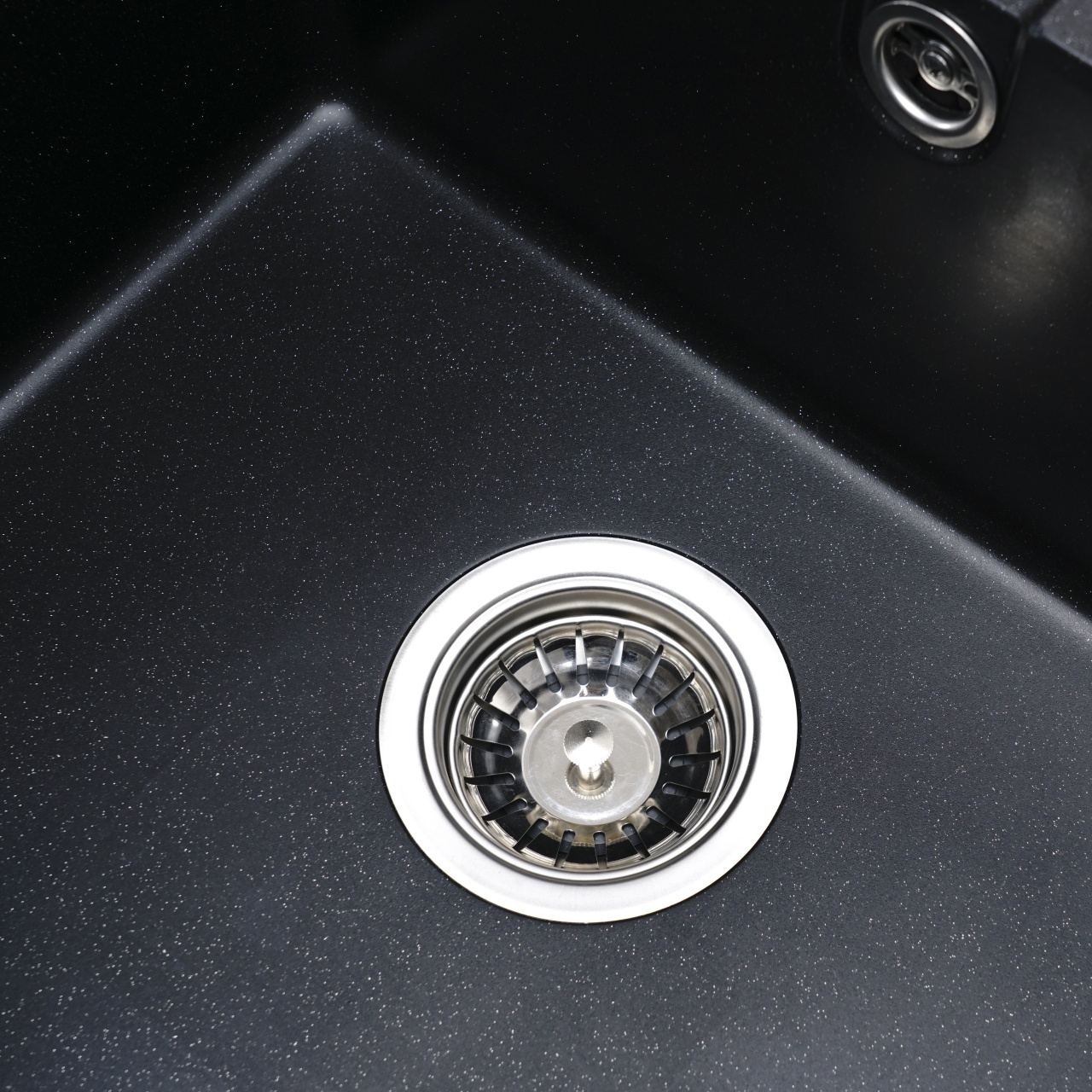 ARIA 5851 Chiuvetă din compozit de granit pentru bucătărie ELEFANT PREMIUM Chiuveta ARIA 5851 este o alegere practică și elegantă pentru orice bucătărie modernă, oferind un design bine echilibrat între funcționalitate și estetică. Fabricată din compozit de granit de înaltă calitate, aceasta este extrem de rezistentă la zgârieturi, pete și temperaturi ridicate, asigurând durabilitate și un aspect premium pe termen lung. Cu o adâncime de 190 mm și o cuvă generoasă, ARIA 5851 este ideală pentru sarcinile zilnice din bucătărie, oferind suficient spațiu pentru spălarea vaselor și pregătirea alimentelor. Chiuveta vine echipată cu un sifon inclus, facilitând instalarea rapidă și eficientă. Detalii Tehnice: ✔ Dimensiune corp: 577x495 mm ✔ Dimensiune cuvă: 430x332x190 mm ✔ Diametru scurgere: 115 mm ✔ Număr cuve: 1 ✔ Scurgere: 3 1/2” ✔ Tip sifon: Simplu ✔ Montare: Pe blat ✔ Material: 80% granule de granit, 20% rășini sintetice ✔ Culoare: Negru metalic ✔ Producător: Elefant Premium ✔ Garanție: 2 ani Pachetul include: ✔ Sistem de scurgere ✔ Sistem de prindere pe blat
