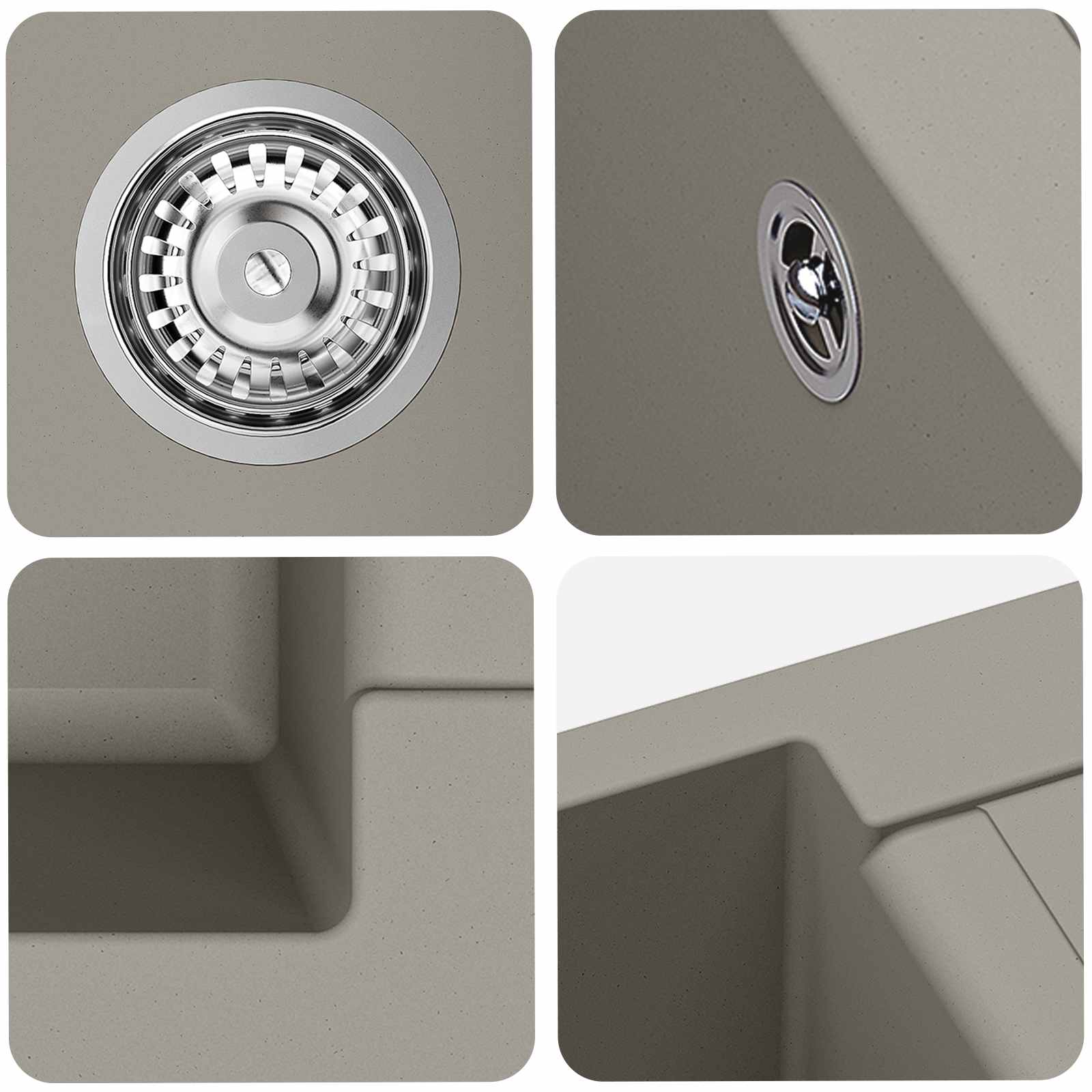 - Materiale: Chiuveta e realizată dintr-un amestec de 80% quartz și 20% rășină, oferind o rezistență mare. Compoziția asta asigură că nu se zgârie ușor, menținându-se impecabilă chiar și cu utilizare intensă.
