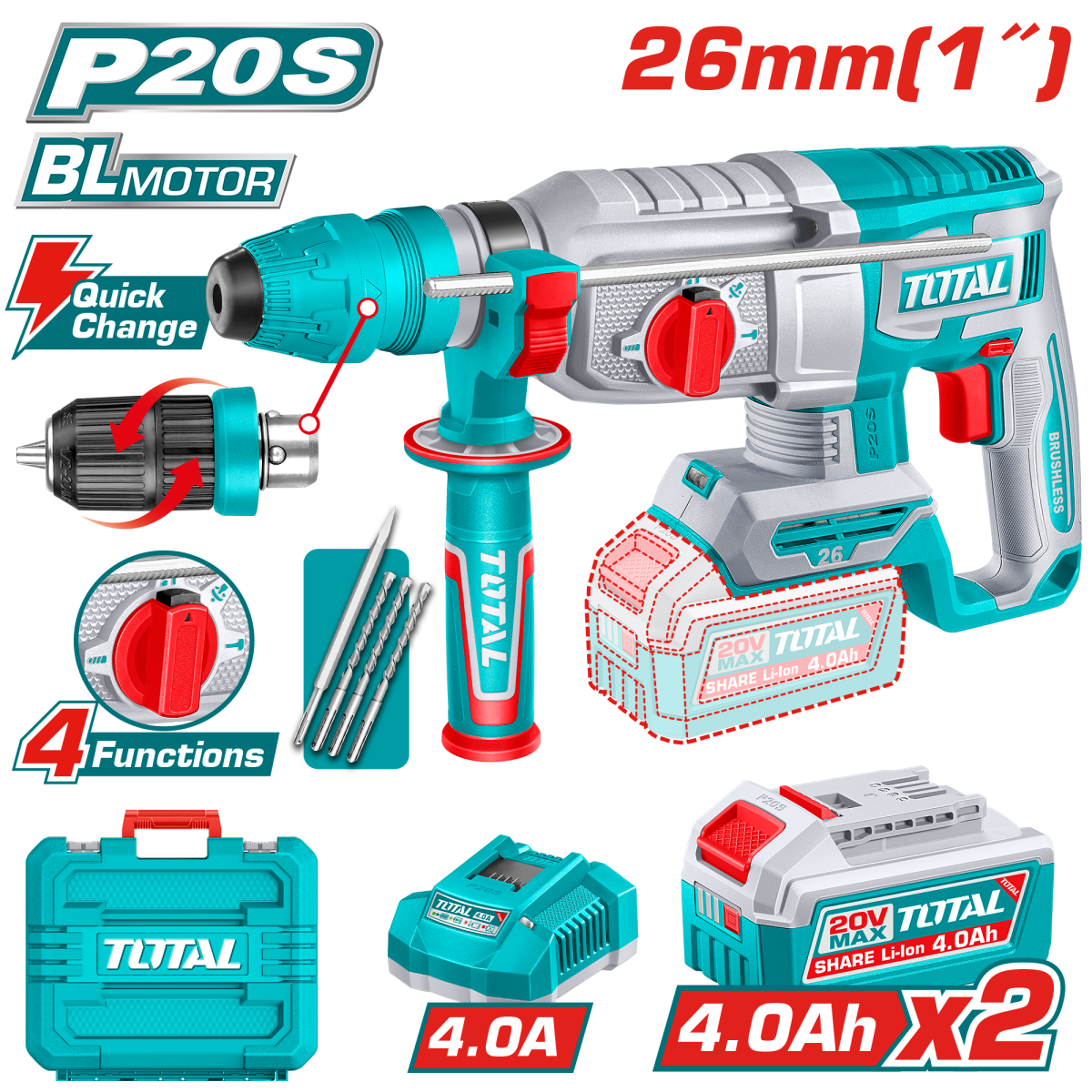 Ciocan rotopercutor TOTAL 20V 2.5J brushless cu 2 acumulatori 4Ah
