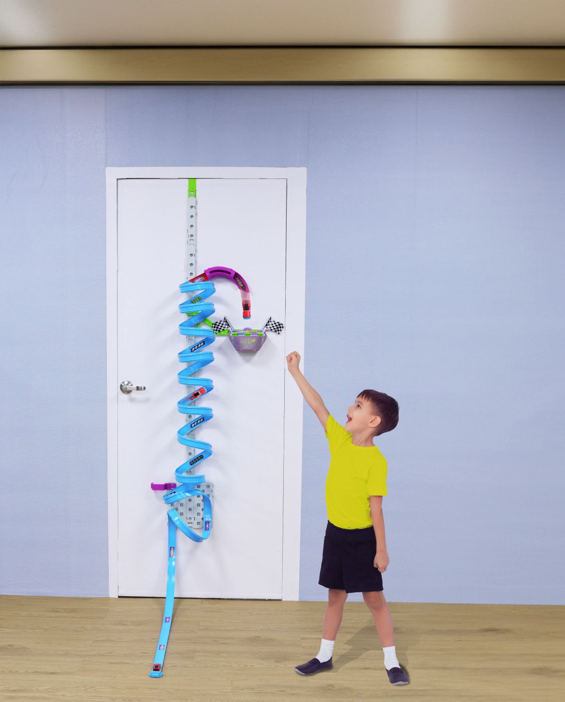 Prin designul sau impresionant si montarea pe verticala, acest set de curse pentru copii este ideal pentru cadou si pentru momente memorabile de joaca acasa.