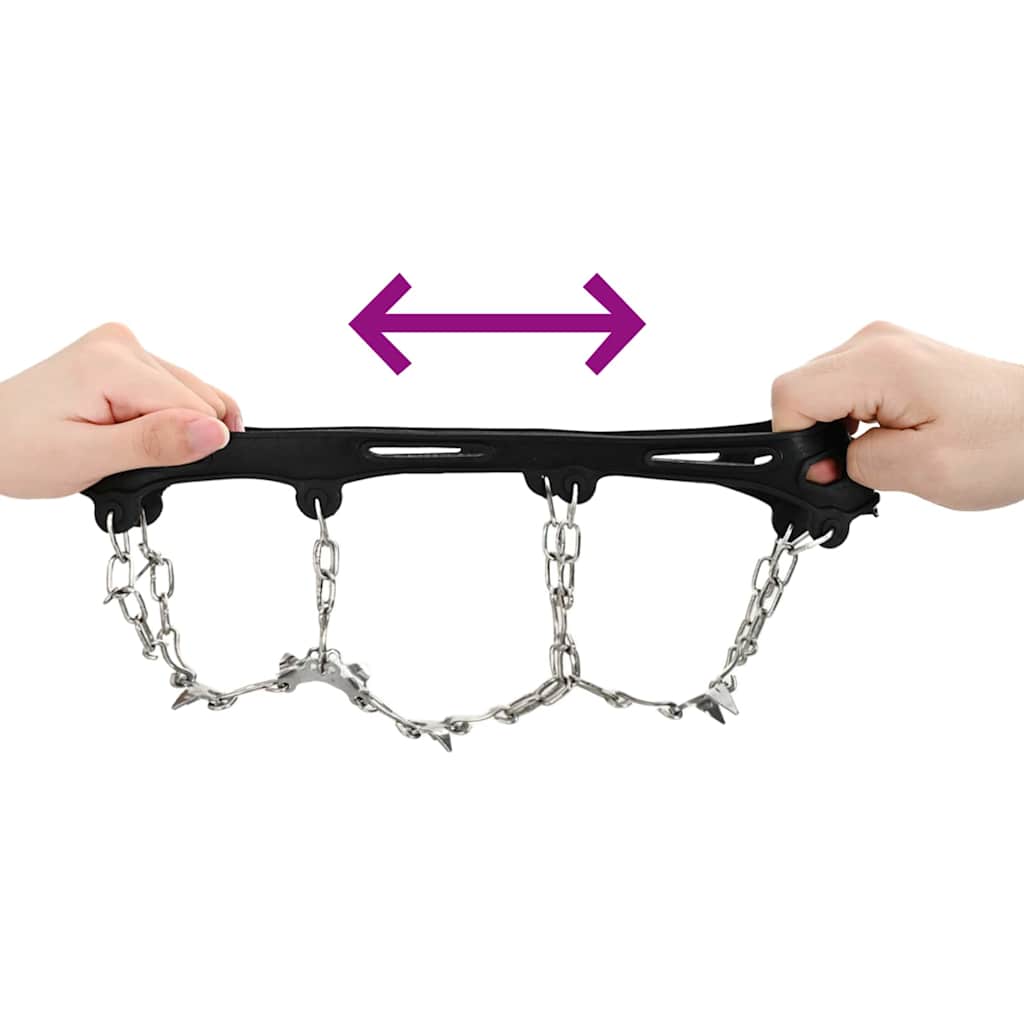 - Caracteristici / Funcție / Design: Fiecare crampoan are 10 dinți din oțel inoxidabil, sporind eficiența aderenței pe suprafețe alunecoase. Curelele cu arici le fac ușor de pus și scos, asigurând o potrivire bună pe orice tip de încălțăminte, de la bocanci la pantofi de trail.