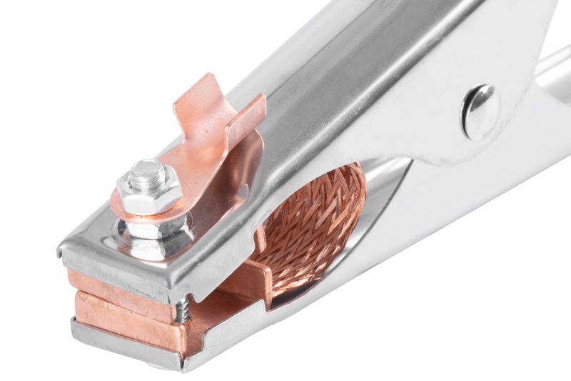 Utilizare: atașați cleștele pe piesa de lucru (zonă curată, fără vopsea/rugină pentru contact optim) și conectați cablul la borna de masă a aparatului de sudură.