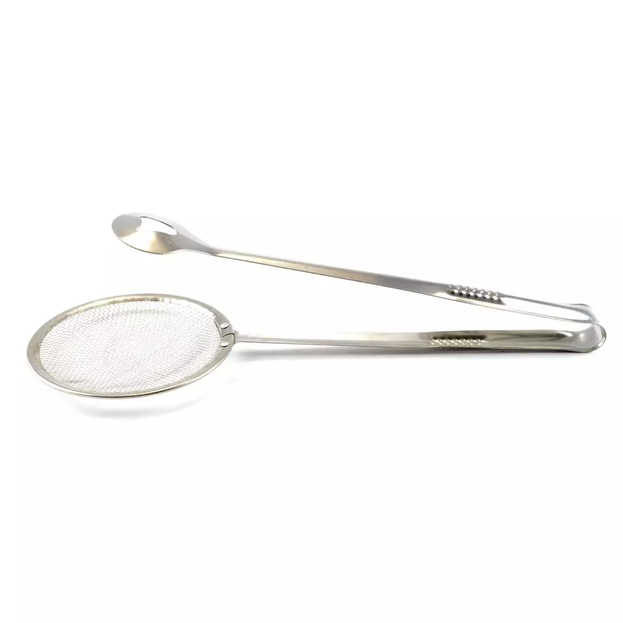 Utilizare: prinde preparatul cu cleștele, ridică-l deasupra cratiței/tigăii și lasă câteva secunde să se scurgă uleiul în sită. Potrivit pentru gogoși, chiftele, șnițele mici sau deserturi prăjite.