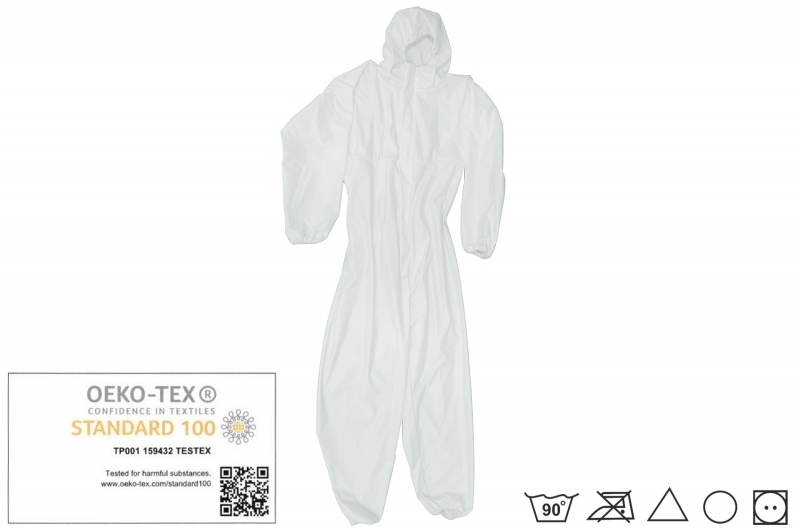 Combinezon alb din Bumbac si Polietilena cu gluga, inchidere cu fermoar, mansete elastice, marimea L, impermeabil, lavabil (in medii in care sunt prezente particule non-agresive ,praf, stropi, murdarie). Acest produs nu este un dispozitiv medical! Produsul este inflamabil, nu va apropiati de flacara deschisa sau surse de caldura ridicata -nu se dezinfecteaza cu clor sau alte substante chimice pentru a nu se deteriora produsul 100% poliester acoperit cu folie de poliuretan Densitate tesatura 120gr./m2 Combinezon refolosibil Lavabil la 90 de grade