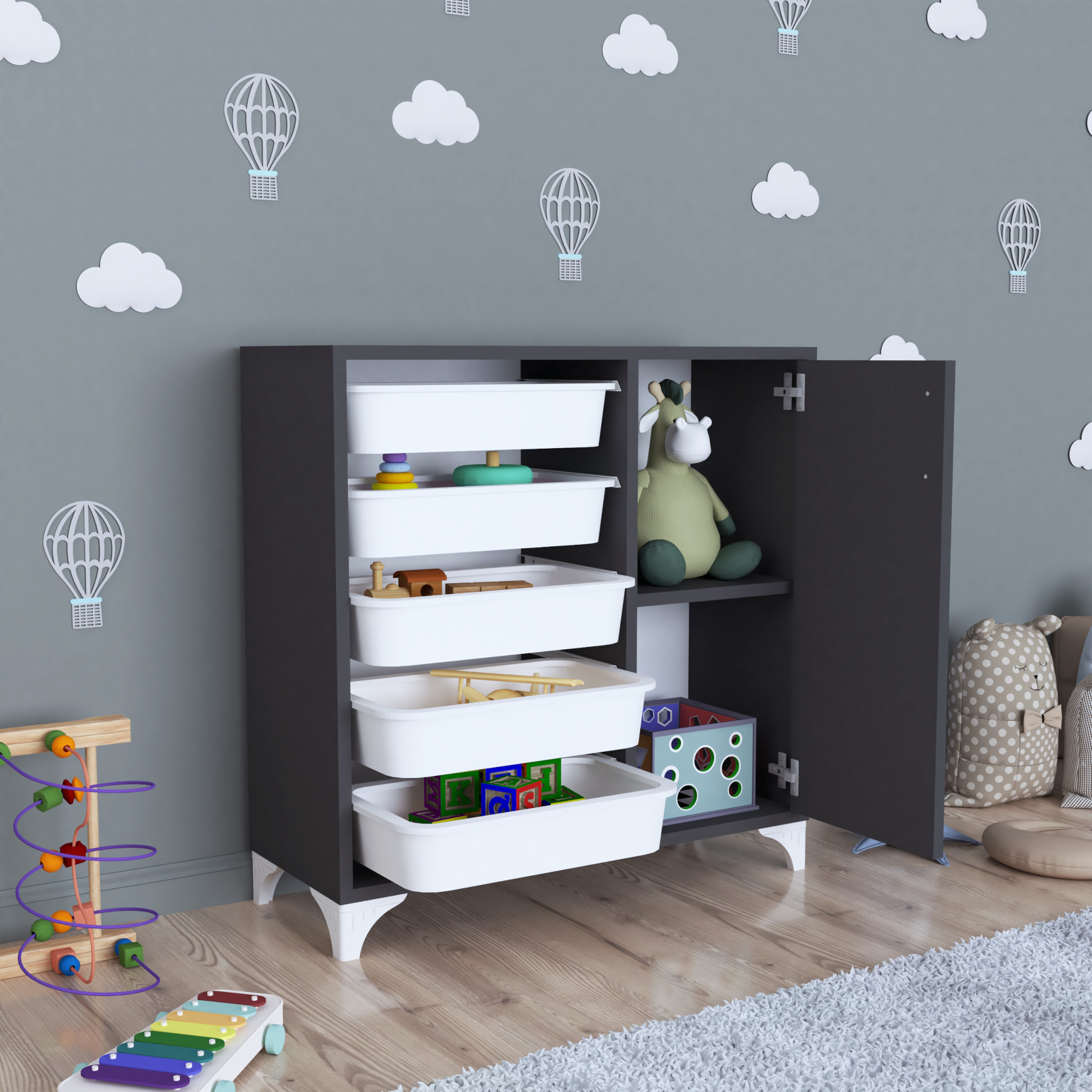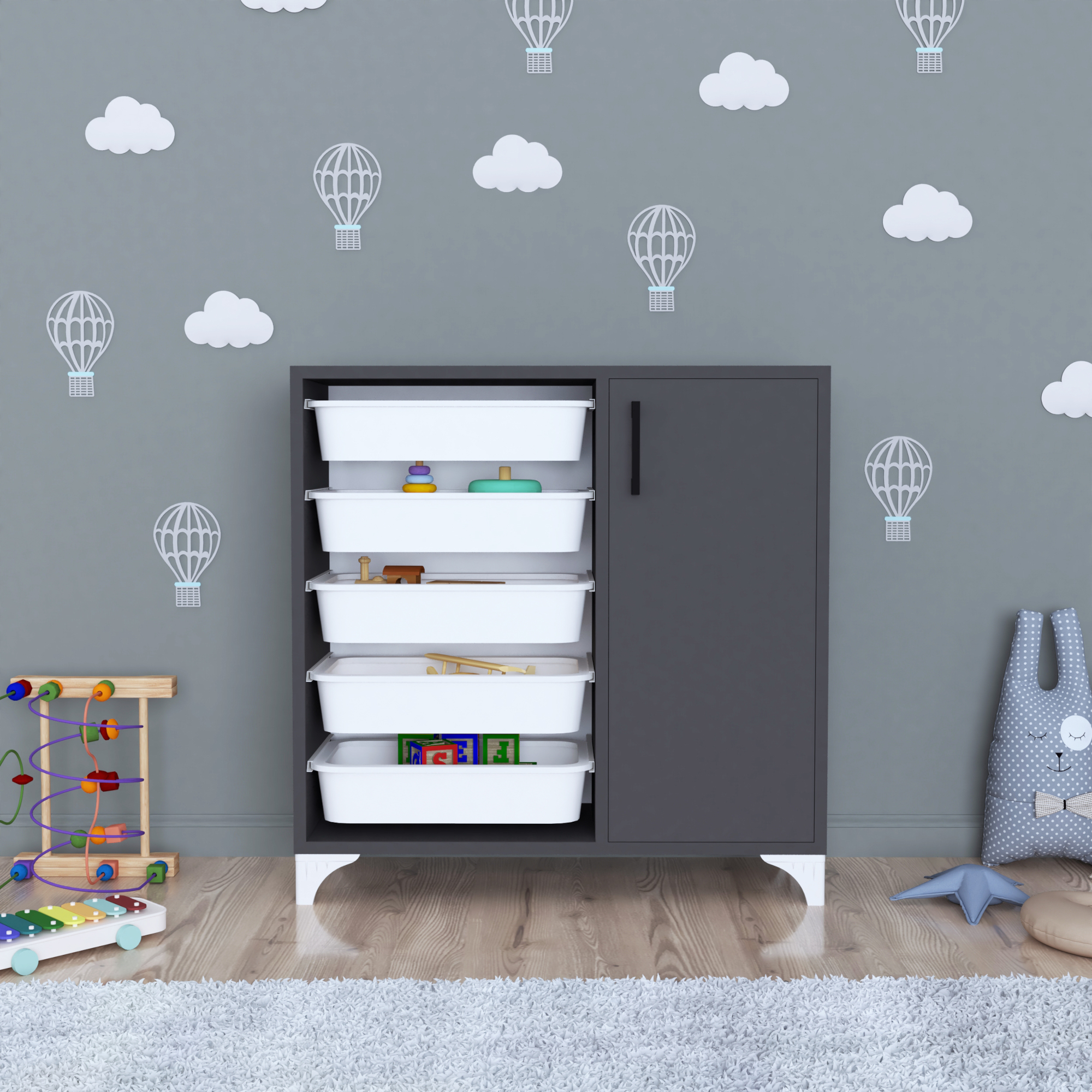Este prevazut cu 1 usa si 5 cosuri generoase pentru depozitare. Este ideal in camera copilului, pentru depozitarea ordonata a jucariilor, cartilor sau obiectelor personale. Designul bine gandit asigura spatiu suplimentar depozitare in interiorul dulapului.