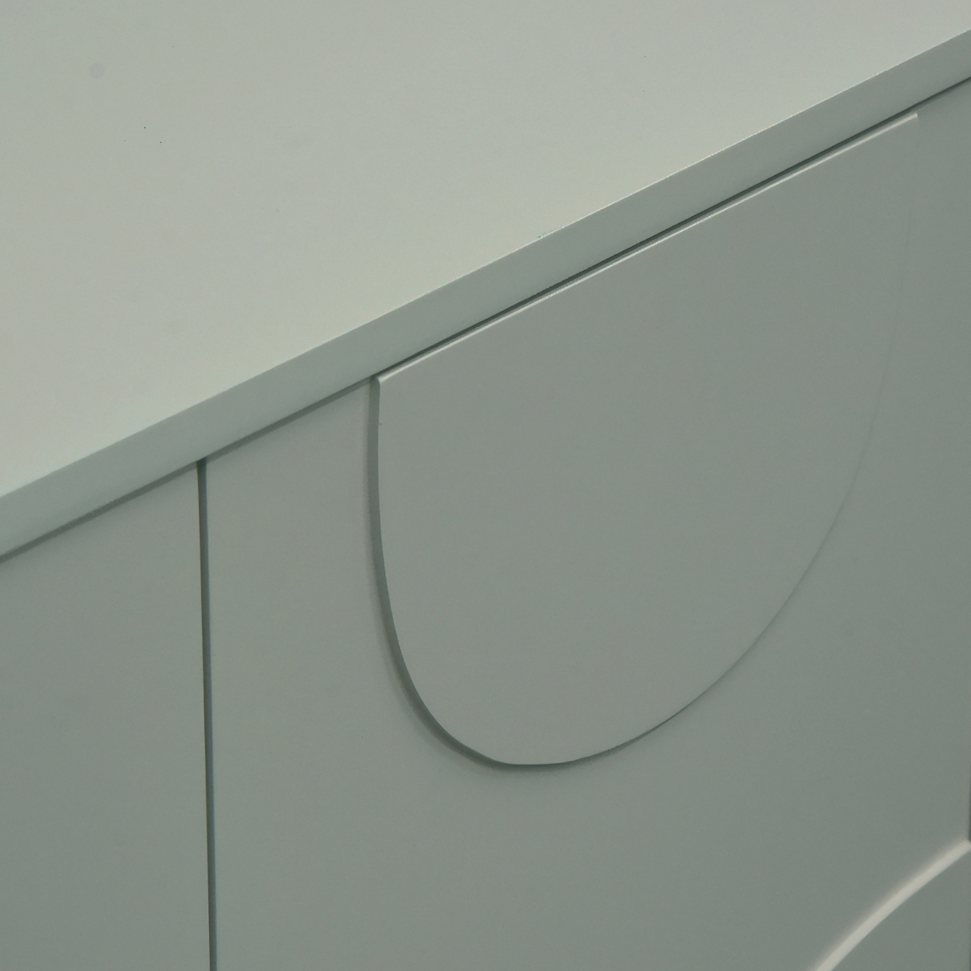 Datorită sistemului Push-to-Open, ușile se deschid printr-o simplă apăsare, fără mânere vizibile, pentru un aspect curat și elegant. Picioarele metalice stabile oferă susținere sigură, iar suprafața este ușor de întreținut, fiind simplu de curățat cu o lavetă umedă.