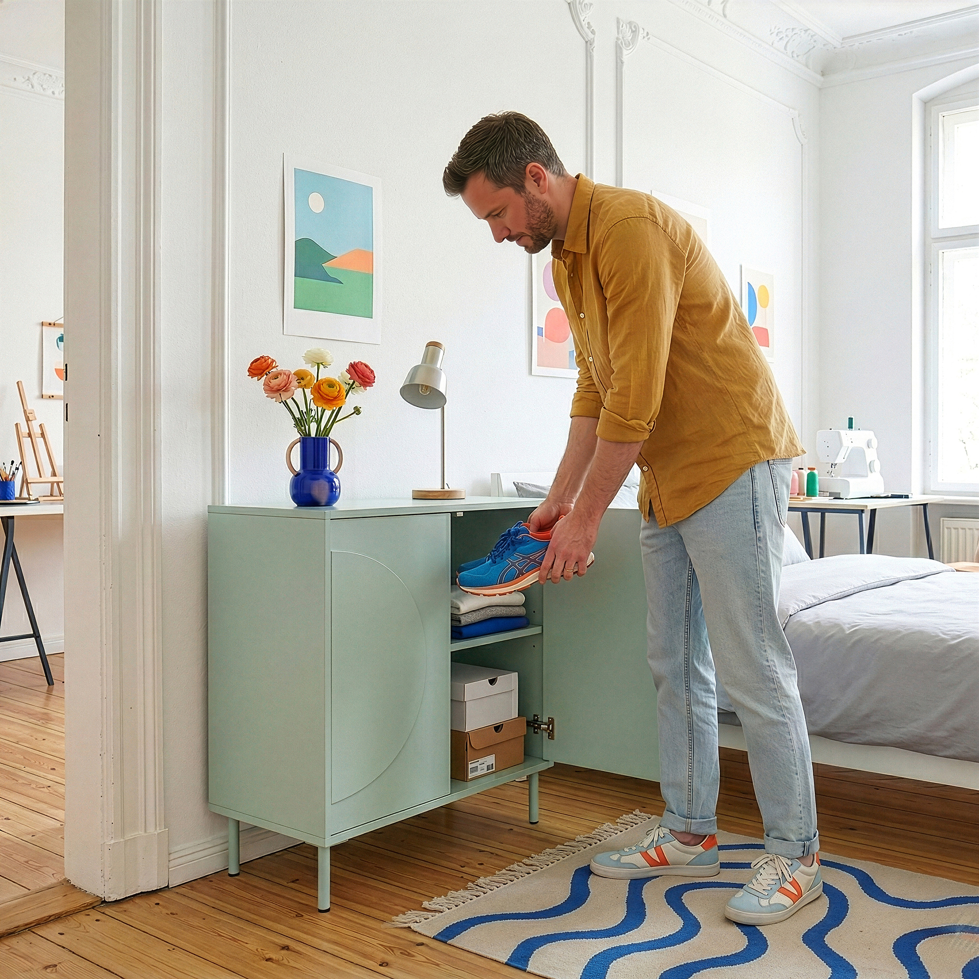 Această comodă verde salvie este potrivită pentru living, hol, dormitor sau birou. O puteți folosi pentru depozitarea cărților, documentelor, textilelor mici, veselei sau a diferitelor obiecte decorative și utile din casă.