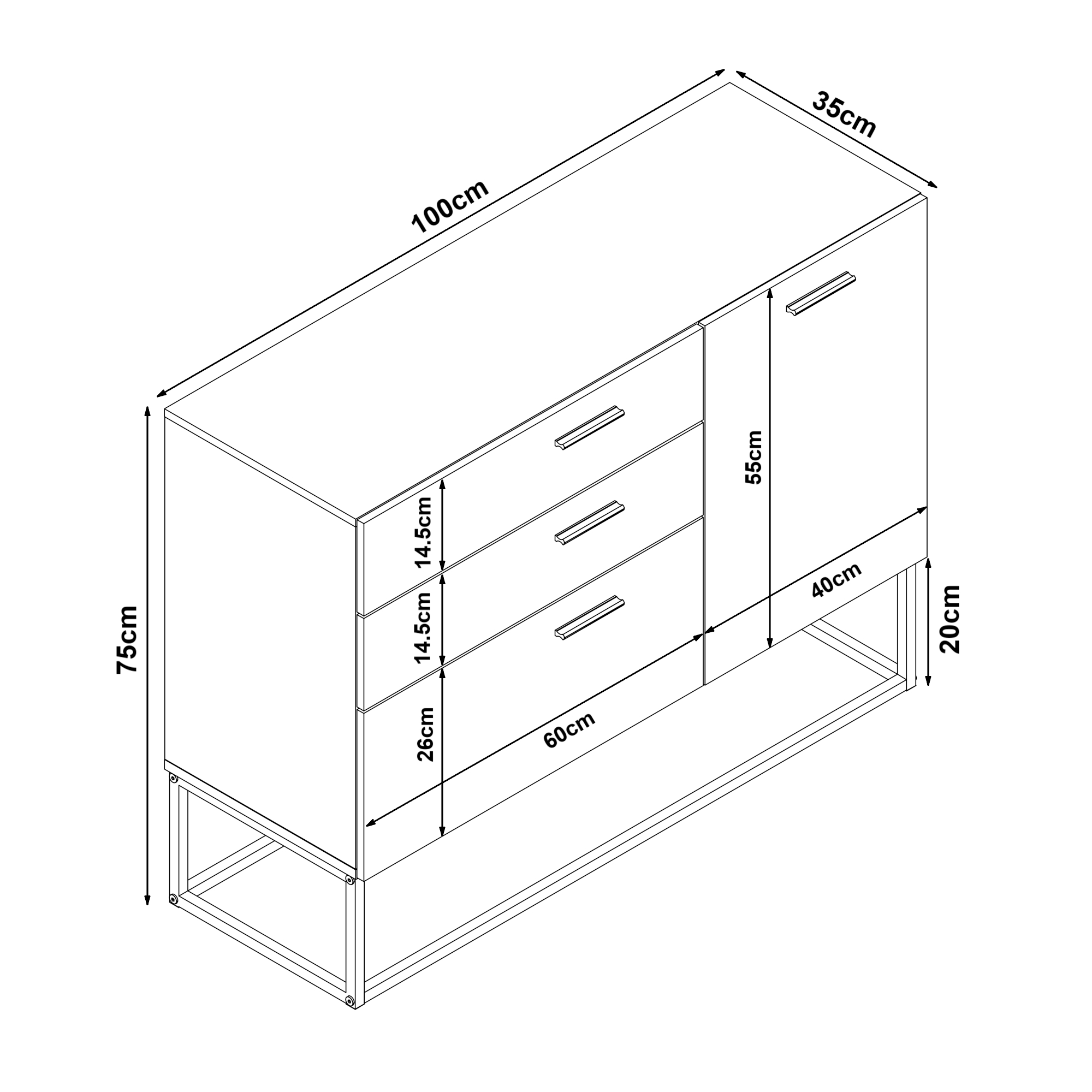 Această comodă de living este ideală pentru păstrarea farfuriilor, tacâmurilor, documentelor, cărților, gadgeturilor sau decorațiunilor. Dimensiunile compacte o fac potrivită și pentru spații mai restrânse, fără să sacrifice volumul util de depozitare.