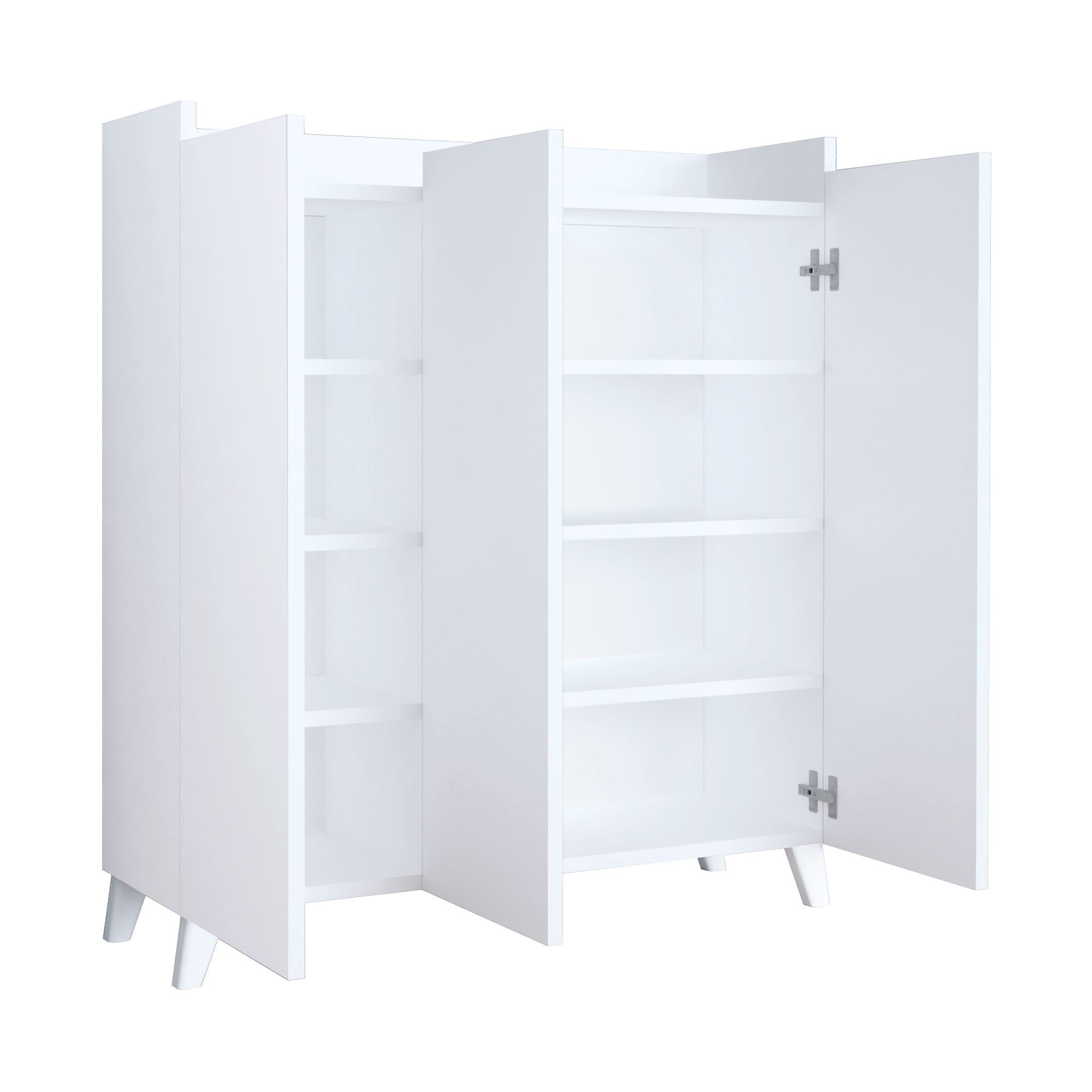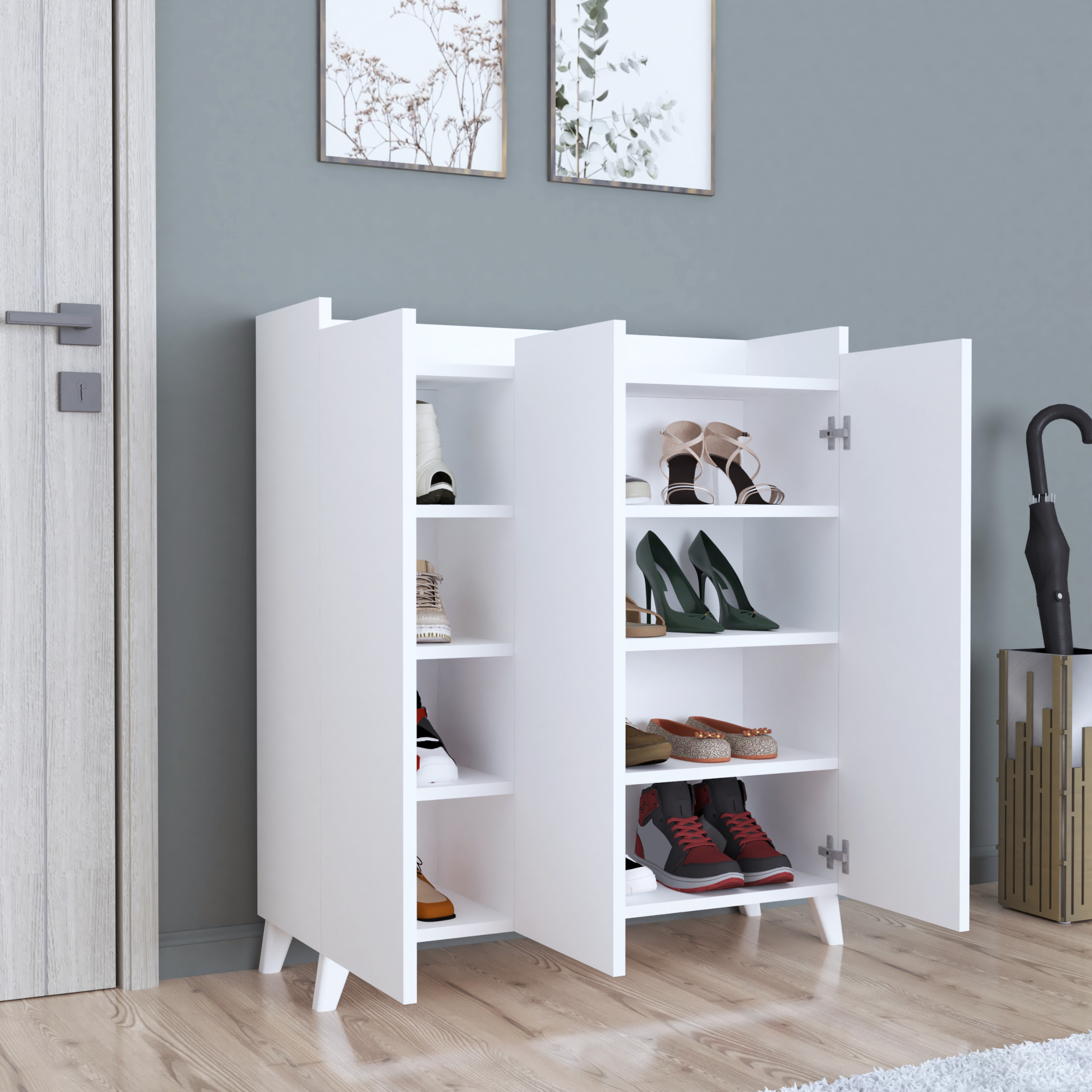 In interiorul dulapului se gasesc patru compartimente mari si patru compartimente mici pentru depozitare, care sunt perfecte pentru sortarea obiectelor. Fie vorba despre obiecte personale, articole de uz casnic sau pantofi, acest dulap ofera spatiu suficient.