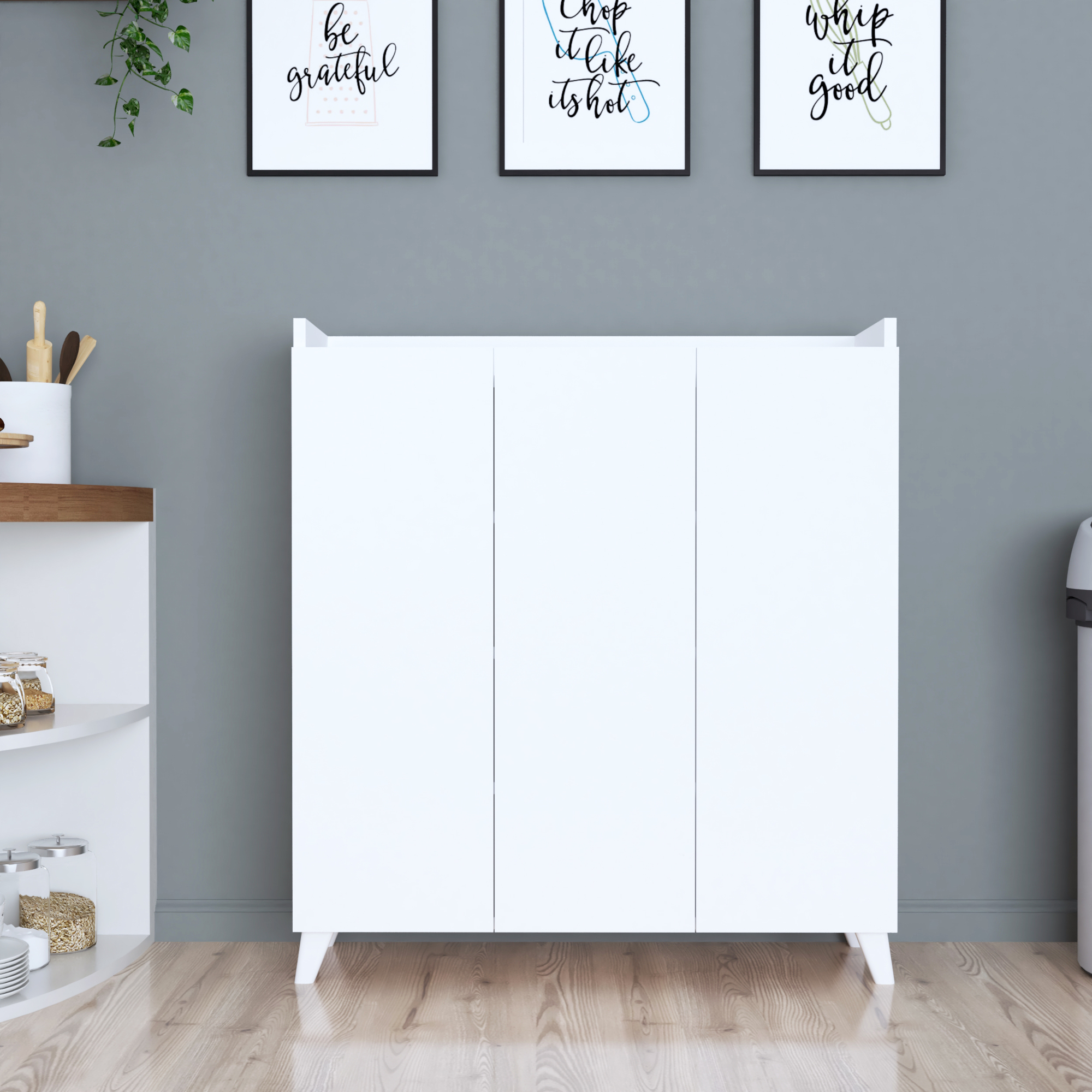 Dulapul prevazut cu trei usi se poate intrebuinta in multe moduri si va arata bine in orice spatiu veti alege sa-l pozitionati. Designul sau simplu si elegant il integreaza armonios in diferite stiluri de amenajari interioare, in timp ce asigura obiectelor extra spatiu depozitare.